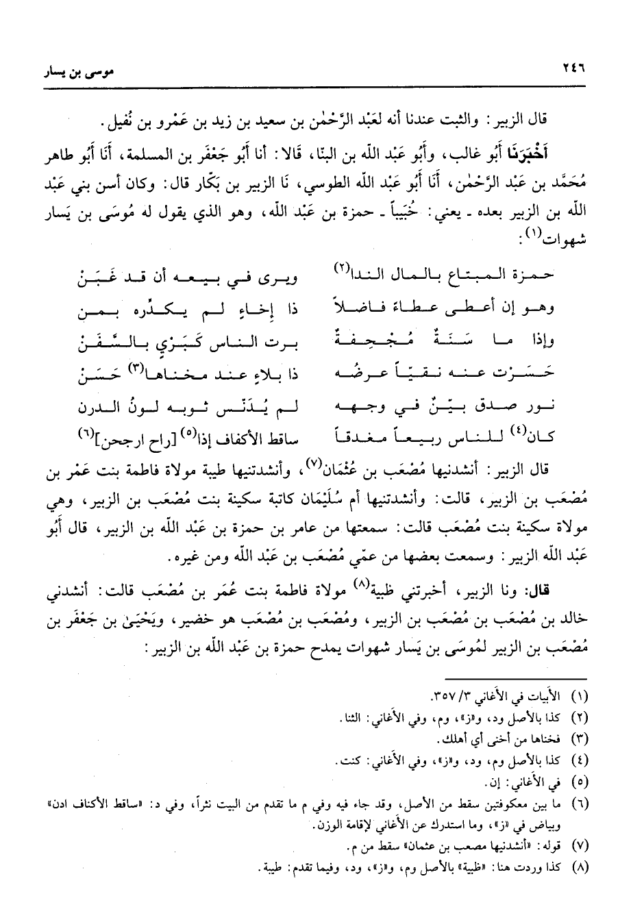 قال الزبير والثبت عندنا أنه لعبد الرحمن بن سعيد بن زيد بن عمرو بن نفيل أخبرنا أبو غالب وأبو عبد الله بن البنا قالا أنا أبو جعفر بن المسلمة أنا أبو طاهر محمد بن عبد الرحمن أنا أبو عبد الله الطوسي نا الزبير بن بكار قال وكان أسن بني عبد الله بن الزبير بعده يعني خبيبا حمزة بن عبد الله وهو الذي يقول له موسى بن يسار شهوات (1) * حمزة المبتاع بالمال الندا (2) * ويرى في بيعه أن قد غبن وهو إن أعطى عطاء فاضلا * ذا إخاء لم يكدره بمن وإذا ما سنة مجحفة * برت الناس كبري بالسفن حسرت عنه نقيا عرضه * ذا بلاء عند مخناها (3) حسن نور صدق بين في وجهه * لم يدنس ثوبه لون الدرن كان (4) للناس ربيعا مغدقا * ساقط الأكفاف إذا (5) راح ارجحن * (6) قال الزبير أنشدنيها مصعب بن عثمان (7) وأنشدتنيها طيبة مولاة فاطمة بنت عمر بن مصعب بن الزبير قالت وأنشدتنيها أم سليمان كاتبة سكينة بنت مصعب بن الزبير وهي مولاة سكينة بنت مصعب قالت سمعتها من عامر بن حمزة بن عبد الله بن الزبير قال أبو عبد الله الزبير وسمعت بعضها من عمي مصعب بن عبد الله ومن غيره قال ونا الزبير أخبرتني ظبية (8) مولاة فاطمة بنت عمر بن مصعب قالت أنشدني خالد بن مصعب بن مصعب بن الزبير ومصعب بن مصعب هو خضير ويحيى بن جعفر بن معصب بن الزبير لموسى بن يسار شهوات يمدح حمزة بن عبد الله بن الزبير