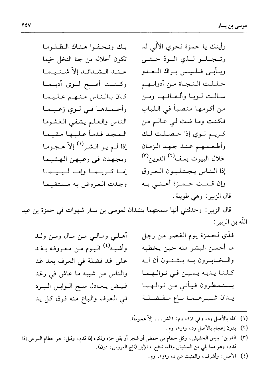 * رأيتك يا حمزة نحوي الألي لد * يك وتحفوا هناك الظلوما وتجلو لذي الود حتى * تكون أحلاله من جنا النخل خيما ويابى فليس يراك العدو * عند الشدائد إلا شتيما حللت النجاة من أدوانهم * وكنت أصح لوى أديما سالت لويا وألفافها ومن * كان بالناس منهم عليما من أكرمها منصبا في اللباب * وأحمدها في لوي زعيما فكنت وما شك لي عالم من * الناس والعلم يشفي الغشوما كريم لوي إذا حصلت لك * المجد قدما عليها مقيما وأطعمهم عند جهد الزمان * إذا لم ير الشر (1) إلا هجوما خلال البيوت يسف (2) الدرين (3) * ويجهدن في رعيهن الهشيما إذا الناس يجتلبون العروق * إما كريما وإما لييما وإن قلت حمزة أعني به * وجدت العروض به مستقيما * قال الزبير وهي طويلة قال الزبير وحدثتني أنها سمعتهما ينشدان لموسى بن يسار شهوات في حمزة بن عبد الله بن الزبير * فدى لحمزة يوم القصر من رجل * أهلي ومالي من مال ومن ولد ما أحسن البشر منه حين يخطبه * وأشبه (4) اليوم من معروفه بغد والخابرون به يثنون أن له * على غد فضلة في العرف بعد غد كلتا يديه يمين في نوالهما * والناس من شيبه ما عاش في رغد يستمطرون فيأتي من نوالهما * فيض يعادل سح الوابل البرد يدان شبرهما باع مفضلة * في العرف والباع منه فوق كل يد