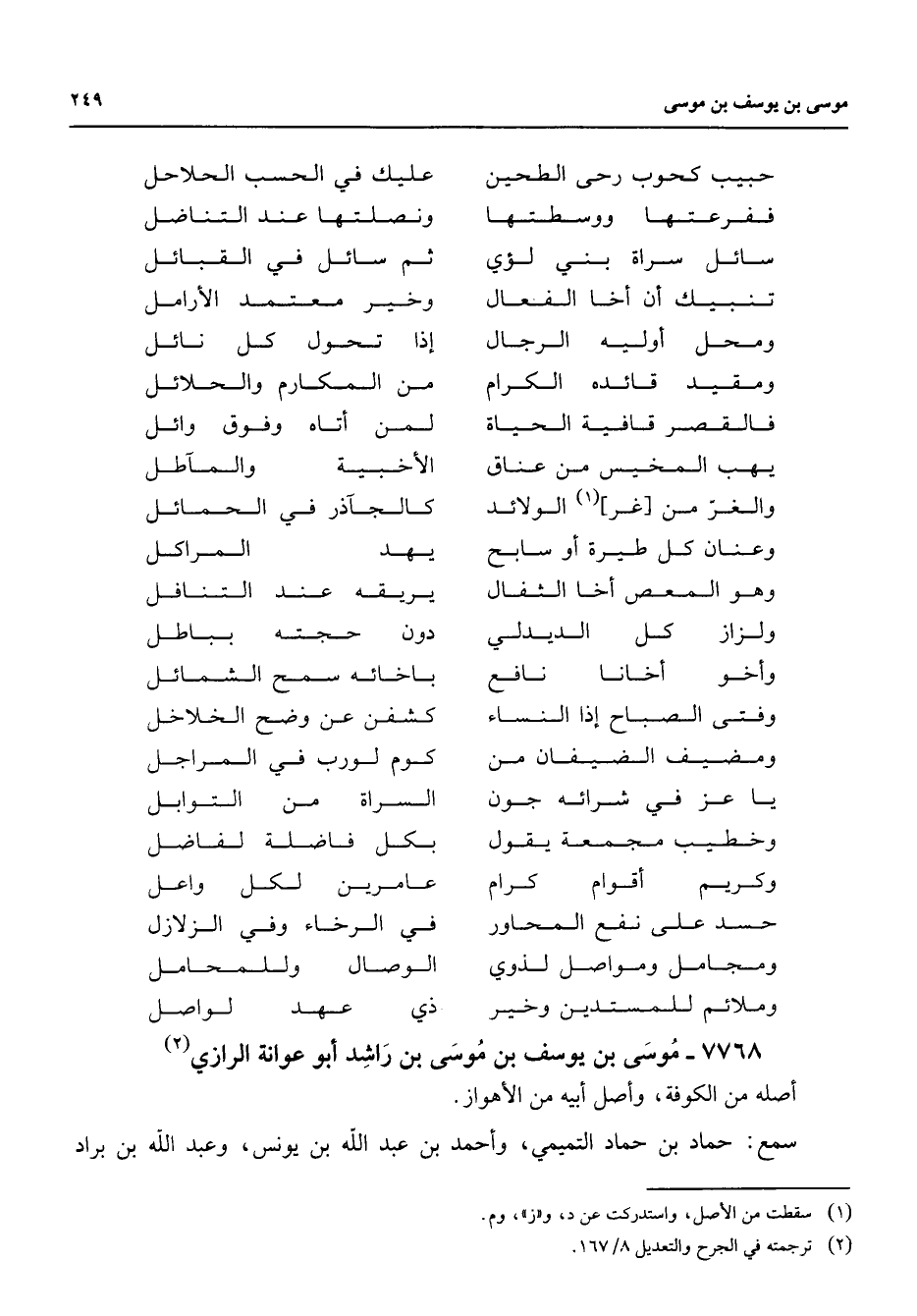 7768 - موسى بن يوسف بن موسى بن راشد أبو عوانة الرازي (2) أصله من الكوفة وأصل أبيه من الأهواز سمع حماد بن حماد التميمي وأحمد بن عبد الله بن يونس وعبد الله بن براد