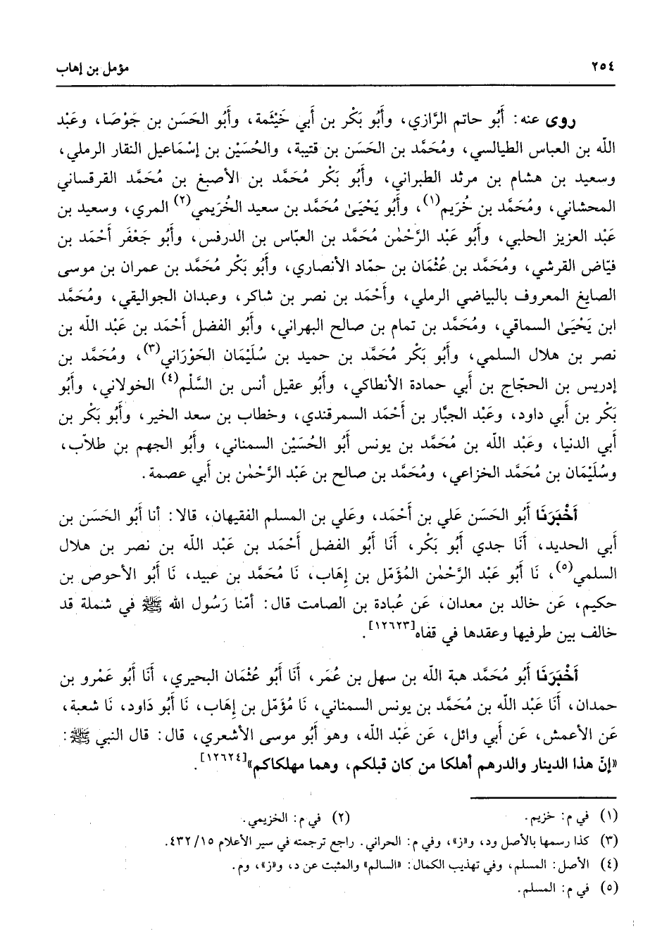 روى عنه أبو حاتم الرازي وأبو بكر بن أبي خيثمة وابو الحسن بن جوصا وعبد الله بن العباس الطيالسي ومحمد بن الحسن بن قتيبة والحسين بن إسماعيل النقار الرملي وسعيد بن هشام بن مرثد الطبراني وأبو بكر محمد بن الأصبع بن محمد القرقساني المحشاني ومحمد بن خريم (1) وأبو يحيى محمد بن سعيد الخريمي (2) المري وسعيد بن عبد العزيز الحلبي وأبو عبد الرحمن محمد بن العباس بن الدرفس وأبو جعفر أحمد بن فياض القرشي ومحمد بن عثمان بن حماد الأنصاري وأبو بكر محمد بن عمران بن موسى الصايغ المعروف بالبياضي الرملي وأحمد بن نصر بن شاكر وعبدان الجواليقي ومحمد ابن يحيى السماقي ومحمد بن تمام بن صالح البهراني وابو الفضل أحمد بن عبد الله بن نصر بن هلال السلمي وأبو بكر محمد بن حميد بن سليمان الحوراني (3) ومحمد بن إدريس بن الحجاج بن ابي حمادة الأنطاكي وأبو عقيل أنس بن السلم (4) الخولاني وابو بكر بن أبي داود وعبد الجبار بن أحمد السمرقندي وخطاب بن سعد الخير وأبو بكر بن أبي الدنيا وعبد الله بن محمد بن يونس أبو الحسين السمناني وأبو الجهم بن طلاب وسليمان بن محمد الخزاعي ومحمد بن صالح بن عبد الرحمن بن أبي عصمة أخبرنا أبو الحسن علي بن أحمد وعلي بن المسلم الفقيهان قالا أنا أبو الحسن بن أبي الحديد أنا جدي أبو بكر أنا أبو الفضل أحمد بن عبد الله بن نصر بن هلال السلمي (5) نا أبو عبد الرحمن المؤمل بن إهاب نا محمد بن عبيد نا أبو الأحوص بن حكيم عن خالد بن معدان عن عبادة بن الصامت قال أمنا رسول الله (صلى الله عليه وسلم) في شملة قد خالف بين طرفيها وعقدها في قفاه أخبرنا أبو محمد هبة الله بن سهل بن عمر أنا أبو عثمان البحيري أنا أبو عمرو بن حمدان أنا عبد الله بن محمد بن يونس السمناني نا مؤمل بن إهاب نا أبو داود نا شعبة عن الأعمش عن أبي وائل عن عبد الله وهو أبو موسى الأشعري قال قال النبي (صلى الله عليه وسلم) إن هذا الدينار والدرهم أهلكا من كان قبلكم وهما مهلكاكم