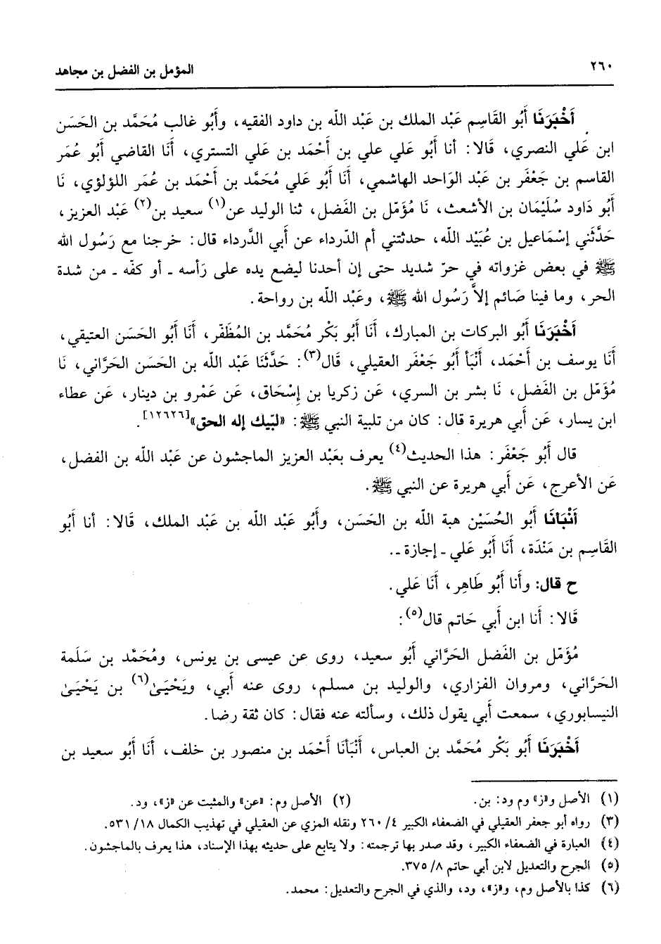 أخبرنا أبو القاسم عبد الملك بن عبد الله بن داود الفقيه وأبو غالب محمد بن الحسن ابن علي النصري قالا أنا أبو علي علي بن أحمد بن علي التستري أنا القاضي أبو عمر القاسم بن جعفر بن عبد الواحد الهاشمي أنا أبو علي محمد بن أحمد بن عمر اللؤلؤي نا أبو داود سليمان بن الأشعث نا مؤمل بن الفضل ثنا الوليد عن (1) سعيد بن (2) عبد العزيز حدثني إسماعيل بن عبيد الله حدثتني أم الدرداء عن أبي الدرداءقال خرجنا مع رسول الله (صلى الله عليه وسلم) في بعض غزواته في حر شديد حتى إن أحدنا ليضع يده على رأسه أو كفه من شدة الحر وما فينا صائم إلا رسول الله (صلى الله عليه وسلم) وعبد الله بن رواحة أخبرنا أبو البركات بن المبارك أنا أبو بكر بن محمد بن المظفر أنا أبو الحسن العتبيقي أنا يوسف بن أحمد أنبأ أبو جعفر العقيلي قال (3) ث عبد الله بن الحسن الحراني نا مؤمل بن الفضل نا بشر بن السري عن زكريا بن إسحاق عن عمرو بن دينار عن عطاء ابن يسار عن أبي هريرة قال كان من تلبية النبي (صلى الله عليه وسلم) لبيك إله الحق قال أبو جعفر هذا الحديث (4) يعرف بعبد العزيز الماجشون عن عبد الله بن الفضل عن الأعرج عن أبي هريرة عن النبي (صلى الله عليه وسلم) أنبأنا أبو الحسين هبة الله بن الحسن وأبو عبد الله بن عبد الملك قالا أنا أبو القاسم بن مندة أنا أبو علي إجازة ح قال وأنا أبو طاهر أنا علي قالا أنا ابن أبي حاتم قال (5) مؤمل بن الفضل الحراني أبو سعيد روى عن عيسى بن يونس ومحمد بن سلمة الحراني ومروان الفزاري والوليد بن مسلم روى عنه أبي ويحيى (6) بن يحيى النيسابوري سمعت أبي يقول ذلك وسألته عنه فقال كان ثقة رضا أخبرنا أبو بكر محمد بن العباس أنبأنا أحمد بن منصور بن خلف أنا أبو سعيد بن