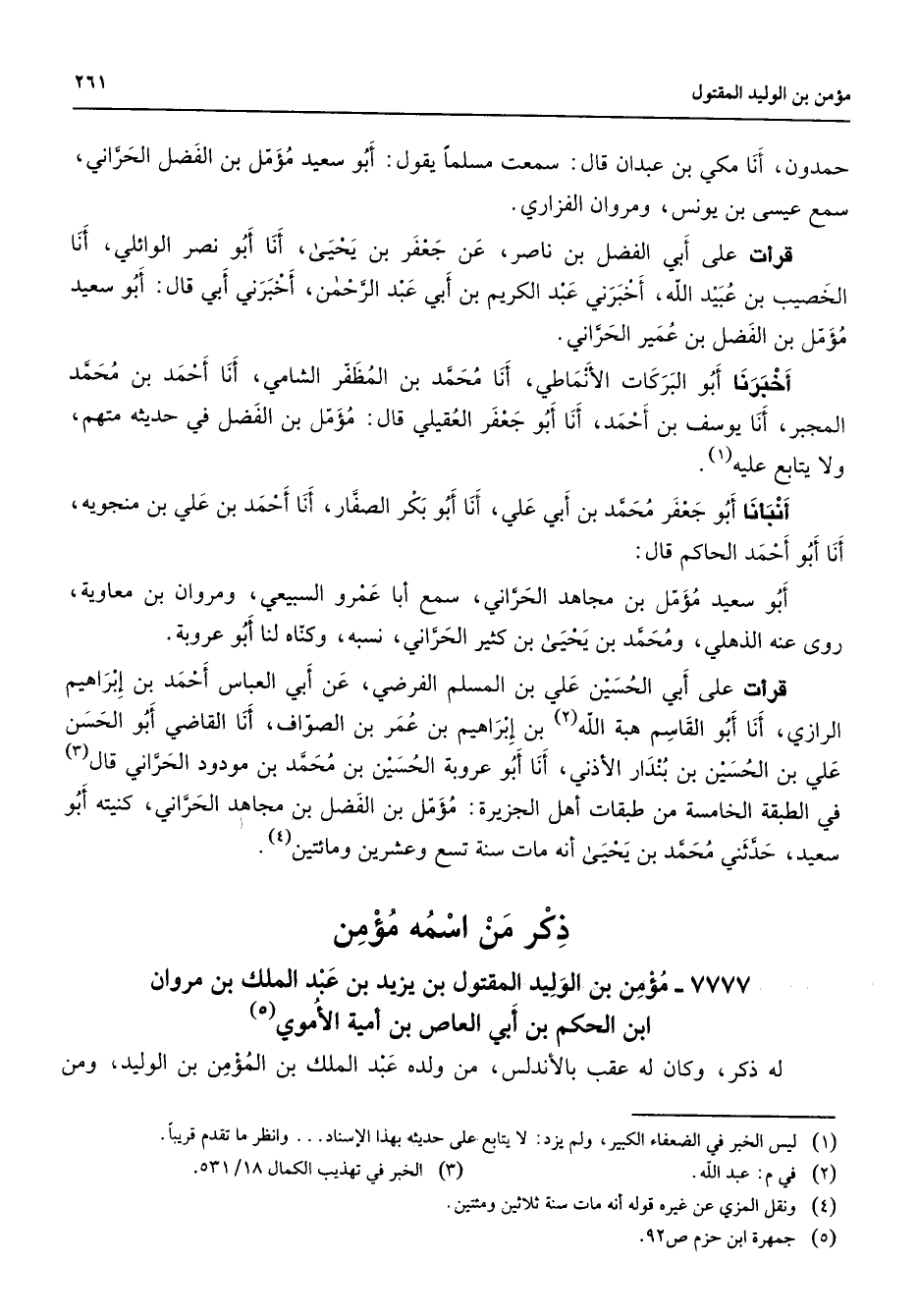 حمدون أنا مكي بن عبدان قال سمعت مسلما يقول أبو سعيد مؤمل بن الفضل الحراني سمع عيسى بن يونس ومروان الفزاري قرأت على أبي الفضل بن ناصر عن جعفر بن يحيى أنا أبو نصر الوائلي أنا الخصيب بن عبيد الله أخبرني عبد الكريم بن أبي عبد الرحمن أخبرني أبي قال أبو سعيد مؤمل بن الفضل بن عمير الحراني أخبرنا أبو البركات الأنماطي أنا محمد بن المظفر الشامي أنا أحمد بن محمد المجبر أنا يوسف بن أحمد أنا أبو جعفر العقيلي قال مؤمل بن الفضل في حديثه متهم ولا يتابع عليه (1) أنبأنا أبو جعفر محمد بن أبي علي أنا أبو بكر الصفار أنا أحمد بن علي بن منجويه أنا أبو أحمد الحاكم قال أبو سعيد مؤمل بن مجاهد الحراني سمع أبا عمرو السبيعي ومروان بن معاوية روى عنه الذهلي ومحمد بن يحيى بن كثير الحراني نسبه وكناه لنا أبو عروبة قرأت على أبي الحسين علي بن المسلم الفرضي عن أبي العباس أحمد بن إبراهيم الرازي أنا أبو القاسم هبة الله (2) بن إبراهيم بن عمر بن الصواف أنا القاضي أبو الحسن علي بن الحسين بن بندار الأذني أنا أبو عروبة الحسين بن محمد بن مودود الحراني قال (3) في الطبقة الخامسة من طبقات أهل الجزيرة مؤمل بن الفضل بن مجاهد الحراني كنيته أبو سعيد حدثني محمد بن يحيى أنه مات سنة تسع وعشرين ومائتين (4) " ذكر من اسمه مؤمن "