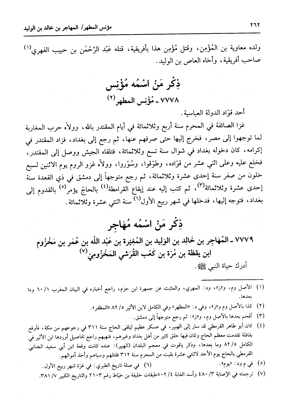 7778 - مؤنس المطهر (2) أحد قواد الدولة العباسية غزا الصائفة في المحرم سنة أربع وثلاثمائة في أيام المقتدر بالله وولاه حرب المغاربة لما توجهوا إلى مصر فخرج إليها حتى صرفهم عنها ثم رجع إلى بغداد فزاد المقتدر في إكرامه كان دخوله بغداد في شوال سنة تسع وثلاثمائة فتلقاه الجيش ووصل إلى المقتدر فخلع عليه وعلى اثني عشر من قواده وطوقوا وسوروا وولاه غزو الروم يوم الاثنين لسبع خلون من صفر سنة إحدى عشرة وثلاثمائة ثم رجع متوجها إلى دمشق في ذي القعدة سنة إحدى عشرة وثلاثمائة (3) ثم كتب إليه عند إيقاع القرامطة (4) بالحاج ويؤمر (5) بالقدوم إلى بغداد فتوجه إليها فدخلها في شهر ربيع الأول (6) سنة اثنتي عشرة وثلاثمائة " ذكر من اسمه مهاجر "