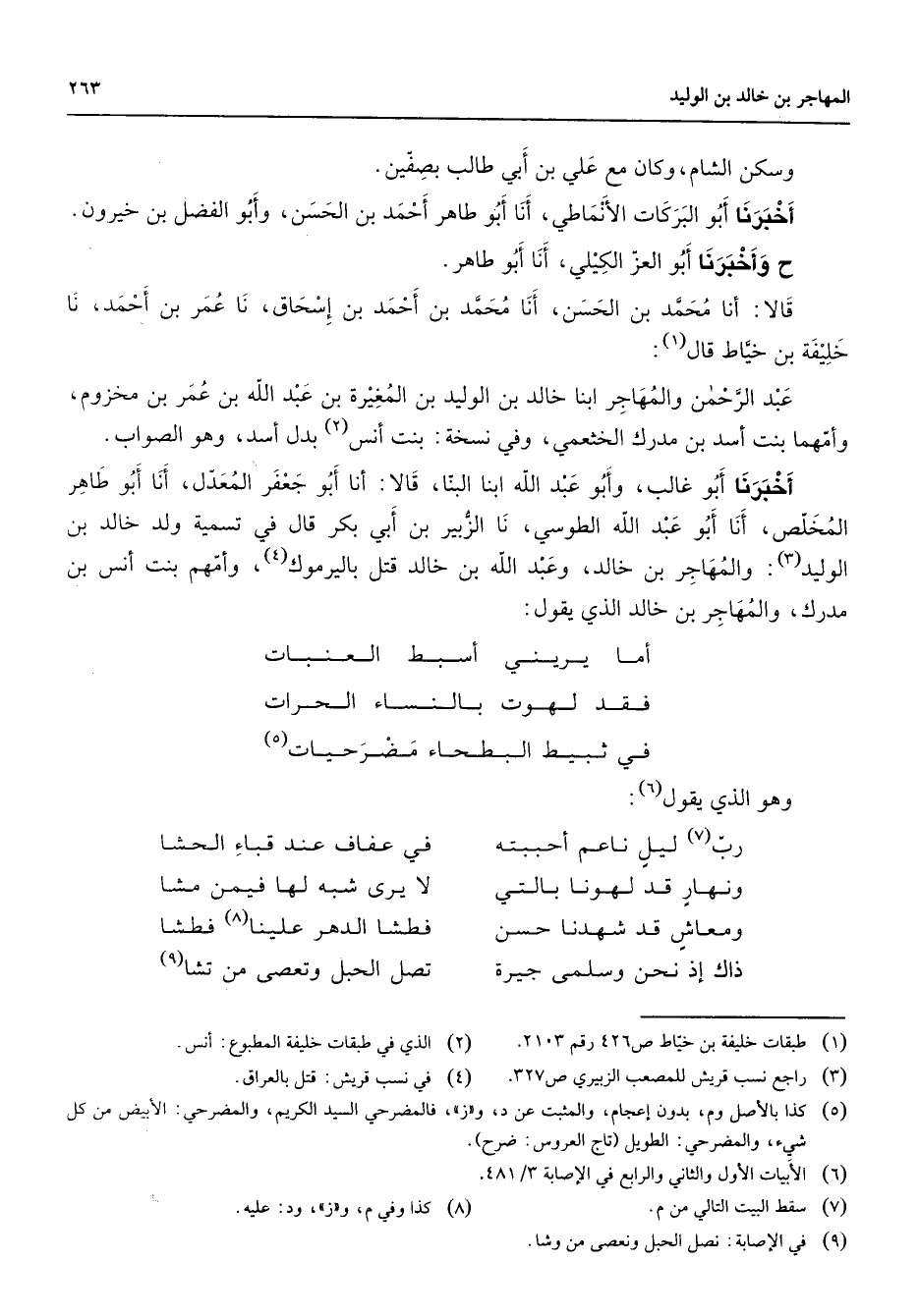 وسكن الشام وكان مع علي بن أبي طالب بصفين أخبرنا أبو البركات الأنماطي أنا أبو طاهر أحمد بن الحسن وأبو الفضل بن خيرون ح وأخبرنا أبو العز الكيلي أنا أبو طاهر قالا أنا محمد بن الحسن أنا محمد بن أحمد بن إسحاق نا عمر بن أحمد نا خليفة بن خياط قال (1) عبد الرحمن والمهاجر ابنا خالد بن الوليد بن المغيرة بن عبد الله بن عمر بن مخزوم وأمهما بنت أسد بن مدرك الخثعمي وفي نسخة بنت أنس (2) بدل أسد وهو الصواب أخبرنا أبو غالب وأبو عبد الله ابنا البنا قالا أنا أبو جعفر المعدل أنا أبو طاهر المخلص أنا أبو عبد الله الطوسي نا الزبير بن أبي بكر قال في تسمية ولد خالد بن الوليد (3) والمهاجر بن خالد وعبد الله بن خالد قتل باليرموك (4) وأمهم بنت أنس بن مدرك والمهاجر بن خالد الذي يقول * أما يريني أسبط العنبات * فقد لهوت بالنساء الحرات * في ثبيط البطحاء مضرحيات (5) وهو الذي يقول (6) * رب (7) ليل ناعم أحببته * في عفاف عند قباء الحشا ونهار قد لهونا بالتي * لا يرى شبه لها فيمن مشا ومعاش قد شهدنا حسن * فطشا الدهر علينا (8) فطشا ذاك إذ نحن وسلمى جيرة * تصل الحبل وتعصى من تشا * (9)
