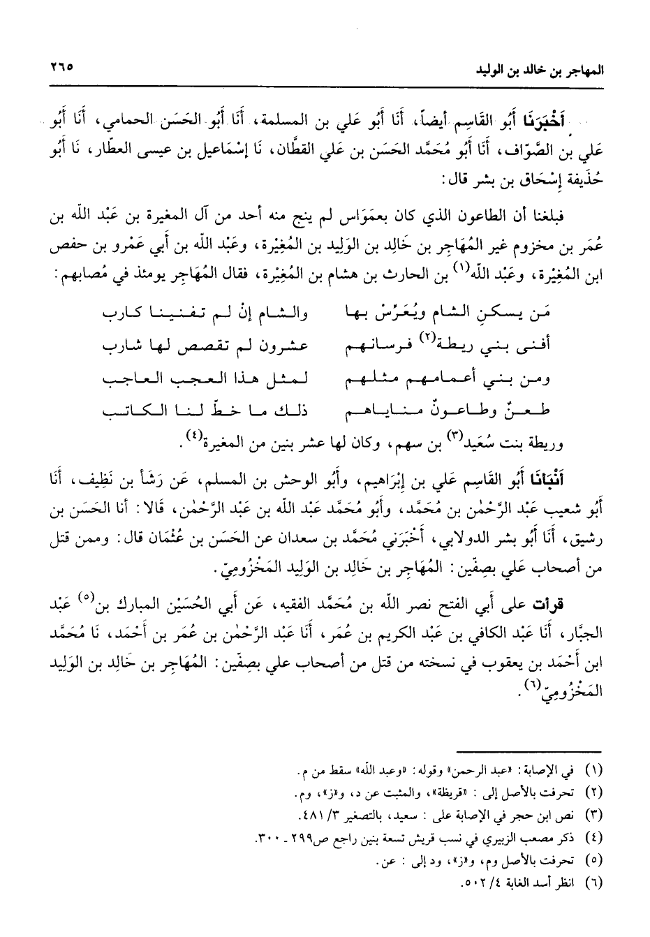 أخبرنا أبو القاسم أيضا أنا أبو علي بن المسلمة أنا أبو الحسن الحمامي أنا أبو علي بن الصواف أنا أبو محمد الحسن بن علي القطان نا إسماعيل بن عيسى العطار نا أبو حذيفة إسحاق بن بشر قال فبلغنا إن الطاعون الذي كان بعمواس لم ينج منه أحد من آل المغيرة بن عبد الله بن عمر بن مخزوم غير المهاجر بن خالد بن الوليد بن المغيرة وعبد الله بن أبي عمرو بن حفص ابن المغيرة وعبد الله (1) بن الحارث بن هشام بن المغيرة فقال المهاجر يومئذ في مصابهم * من يسكن الشام ويعرس بها * والشام إن لم تفنينا كارب أفنى بني ريطة (2) فرسانهم * عشرون لم تقصص لها شارب ومن بني أعمامهم مثلهم * لمثل هذا العجب العاجب طعن وطاعون مناياهم * ذلك ما خط لنا الكاتب * وريطة بنت سعيد (3) بن سهم وكان لها عشر بنين من المغيرة (4) أنبأنا أبو القاسم علي بن إبراهيم وابو الوحش بن المسلم عن رشأ بن نظيف أنا أبو شعيب عبد الرحمن بن محمد وابو محمد عبد الله بن عبد الرحمن قالا أنا الحسن بن رشيق أنا أبو بشر الدولابي أخبرني محمد بن سعدان عن الحسن بن عثمان قال وممن قتل من أصحاب علي بصفين المهاجر بن خالد بن الوليد المخزومي قرأت على أبي الفتح نصر الله بن محمد الفقيه عن أبي الحسين المبارك بن (5) عبد الجبار أنا عبد الكافي بن عبد الكريم بن عمر أنا عبد الرحمن بن عمر بن أحمد نا محمد ابن أحمد بن يعقوب في نسخته من قتل من أصحاب علي بصفين المهاجر بن خالد بن الوليد المخزومي (6)