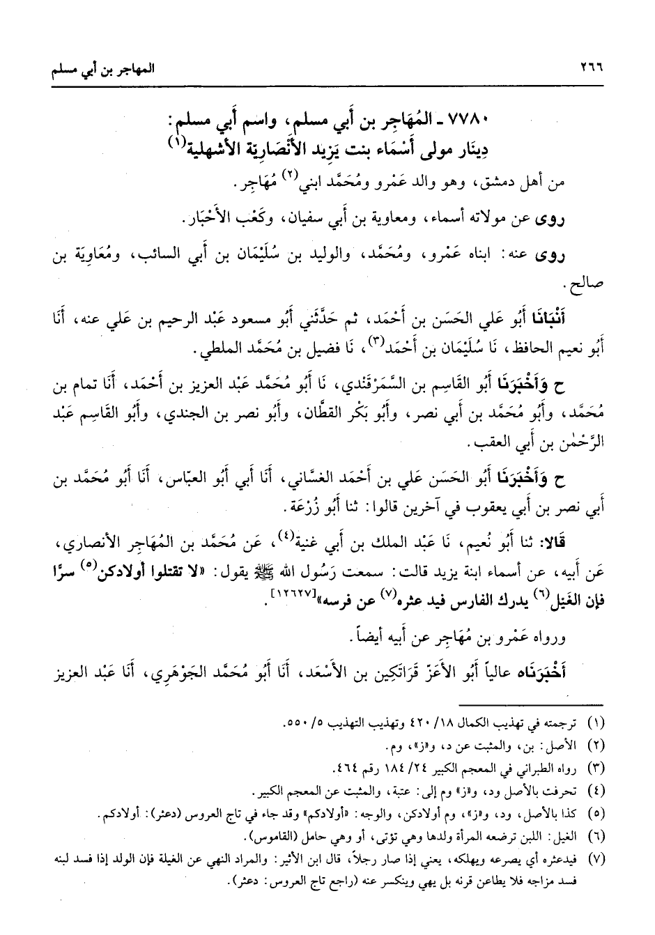 7780 - المهاجر بن أبي مسلم واسم أبي مسلم دينار مولى أسماء بنت يزيد الأنصارية الأشهلية (1) من أهل دمشق وهو والد عمرو ومحمد ابني (2) مهاجر روى عن مولاته أسماء ومعاوية بن أبي سفيان وكعب الأحبار روى عنه ابناه عمرو ومحمد والوليد بن سليمان بن أبي السائب ومعاوية بن صالح أنبأنا أبو علي الحسن بن أحمد ثم حدثني أبو مسعود عبد الرحيم بن علي عنه أنا أبو نعيم الحافظ نا سليمان بن أحمد (3) نا فضيل بن محمد الملطي ح وأخبرنا أبو القاسم بن السمرقندي نا أبو محمد عبد العزيز بن أحمد أنا تمام بن محمد وأبو محمد بن أبي نصر وأبو بكر القطان وأبو نصر بن الجندي وأبو القاسم عبد الرحمن بن أبي العقب ح وأخبرنا أبو الحسن علي بن أحمد الغساني أنا أبي أبو العباس أنا أبو محمد بن أبي نصر بن أبي يعقوب في آخرين قالوا ثنا أبو زرعة قالا ثنا أبو نعيم نا عبد الملك بن أبي غنية (4) عن محمد بن المهاجر الأنصاري عن أبيه عن أسماء ابنة يزيد قالت سمعت رسول الله (صلى الله عليه وسلم) يقول لا تقتلوا أولادكن (5) سرا فإن الغيل (6) يدرك الفارس فيدعثره (7) عن فرسه ورواه عمرو بن مهاجر عن أبيه أيضا أخبرناه عاليا أبو الأعز قراتكين بن الأسعد أنا أبو محمد الجوهري أنا عبد العزيز