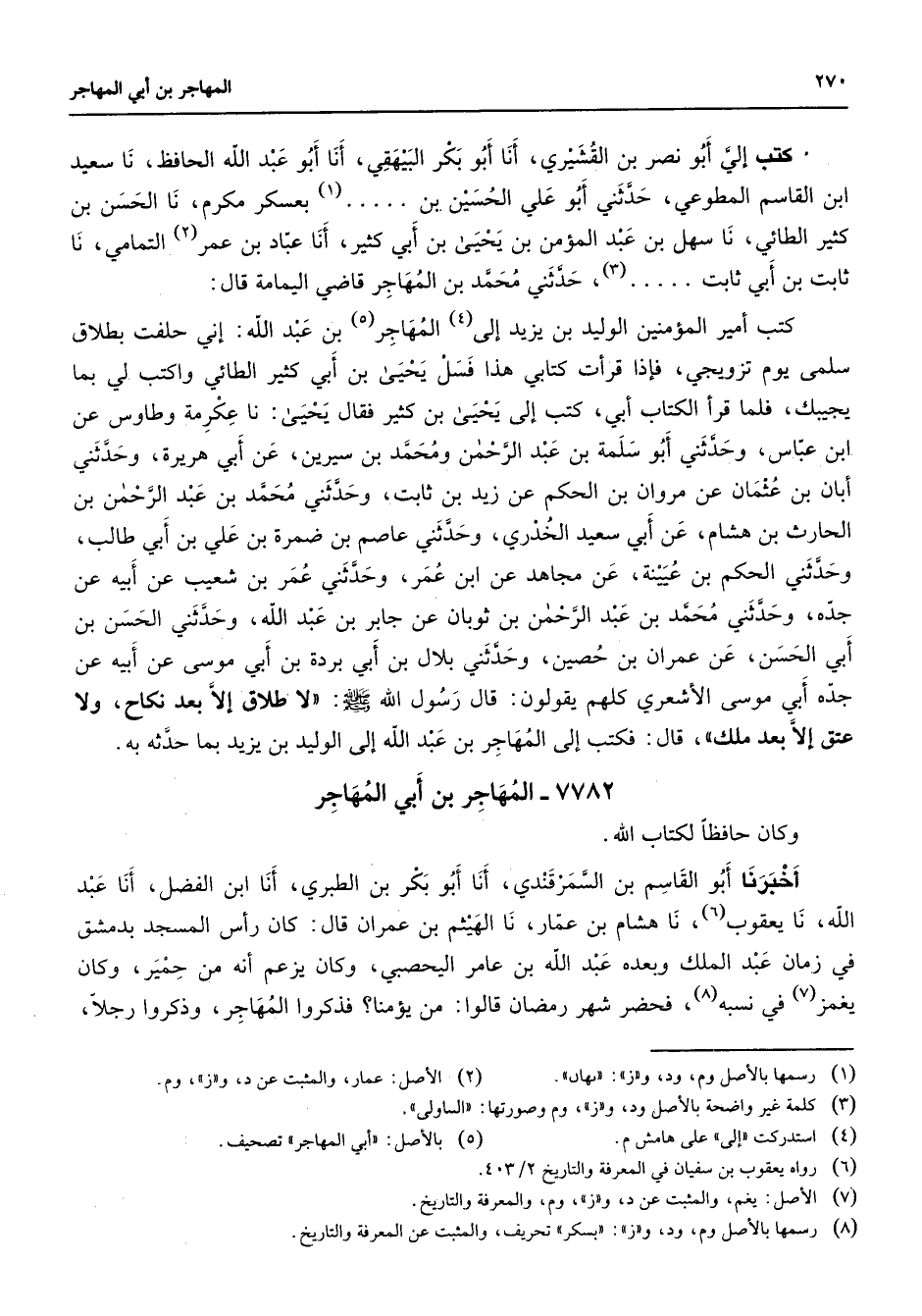 7782 - المهاجر بن أبي المهاجر وكان حافظا لكتاب الله أخبرنا أبو القاسم بن السمرقندي أنا أبو بكر بن الطبري أنا ابن الفضل أنا عبد الله نا يعقوب (6) نا هشام بن عمار نا الهيثم بن عمران قال كان رأس المسجد بدمشق في زمان عبد الملك وبعده عبد الله بن عامر اليحصبي وكان يزعم أنه من حمير وكان يغمز (7) في نسبه (8) فحضر شهر رمضان قالوا من يؤمنا فذكروا المهاجر وذكروا رجلا