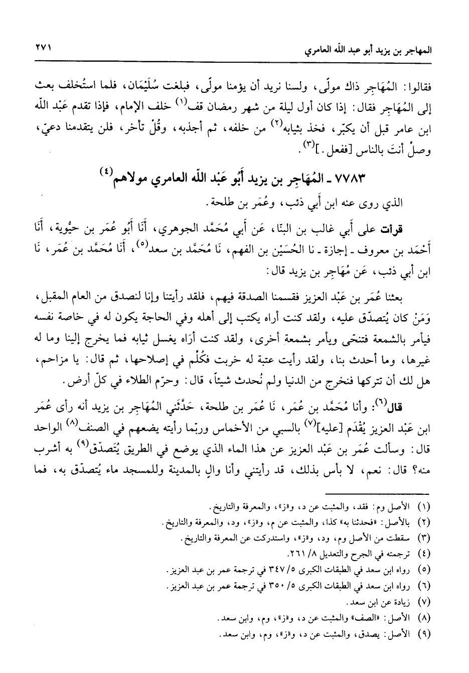 7783 - المهاجر بن يزيد أبو عبد الله العامري مولاهم (4) الذي روى عنه ابن أبي ذئب وعمر بن طلحة قرأت على أبي غالب بن البنا عن أبي محمد الجوهري أنا أبو عمر بن حيوية أنا أحمد بن معروف إجازة نا الحسين بن الفهم نا محمد بن سعد (5) أنا محمد بن عمر نا ابن أبي ذئب عن مهاجر بن يزيد قال بعثنا عمر بن عبد العزيز فقسمنا الصدقة فيهم فلقد رأيتنا وإنا لنصدق من العام المقبل ومن كان يتصدق عليه ولقد كنت أراه يكتب إلى أهله وفي الحاجة يكون له في خاصة نفسه فيأمر بالشمعة فتنحى ويأمر بشمعة أخرى ولقد كنت أراه يغسل ثيابه فما يخرج إلينا وما له غيرها وما أحدث بنا ولقد رأيت عتبة له خربت فكلم في إصلاحها ثم قال يا مزاحم هل لك أن تتركها فنخرج من الدنيا ولم نحدث شيئا قال وحرم الطلاء في كل أرض قال (6) وأنا محمد بن عمر نا عمر بن طلحة حدثني المهاجر بن يزيد أنه رأى عمر ابن عبد العزيز يقدم عليه (7) بالسبي من الأخماس وربما رأيتهم يضعهم في الصنف (8) الواحد قال وسألت عمر بن عبد العزيز عن هذا الماء الذي يوضع في الطريق يتصدق (9) به أشرب منه قال نعم لا بأس بذلك قد رأيتني وأنا وال بالمدينة وللمسجد ماء يتصدق به فما