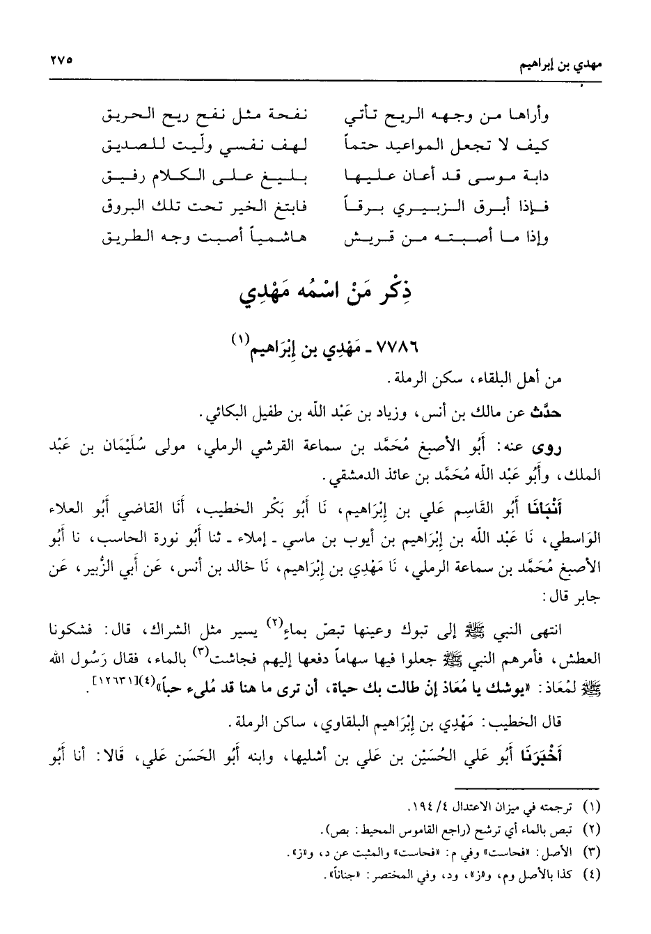 7786 - مهدي بن إبراهيم (1) من أهل البلقاء سكن الرملة حدث عن مالك بن أنس وزياد بن عبد الله بن طفيل البكائي روى عنه أبو الأصبغ محمد بن سماعة القرشي الرملي مولى سليمان بن عبد الملك وأبو عبد الله محمد بن عائذ الدمشقي أنبأنا أبو القاسم علي بن إبراهيم نا أبو بكر الخطيب أنا القاضي أبو العلاء الواسطي نا عبد الله بن إبراهيم بن أيوب بن ماسي إملاء ثنا أبو نورة الحاسب نا أبو الأصبغ محمد بن سماعة الرملي نا مهدي بن إبراهيم نا خالد بن أنس عن أبي الزبير عن جابر قال انتهى النبي (صلى الله عليه وسلم) إلى تبوك وعينها تبص بماء (2) يسير مثل الشراك قال فشكونا العطش فأمرهم النبي (صلى الله عليه وسلم) جعلوا فيها سهاما دفعها إليهم فجاشت (3) بالماء فقال رسول الله (صلى الله عليه وسلم) لمعاذ يوشك يا معاذ إن طالت بك حياة أن ترى ما هنا قد ملى حبا (4) قال الخطيب مهدي بن إبراهيم البلقاوي ساكن الرملة أخبرنا أبو علي الحسين بن علي بن أشليها وابنه أبو الحسن علي قالا أنا أبو