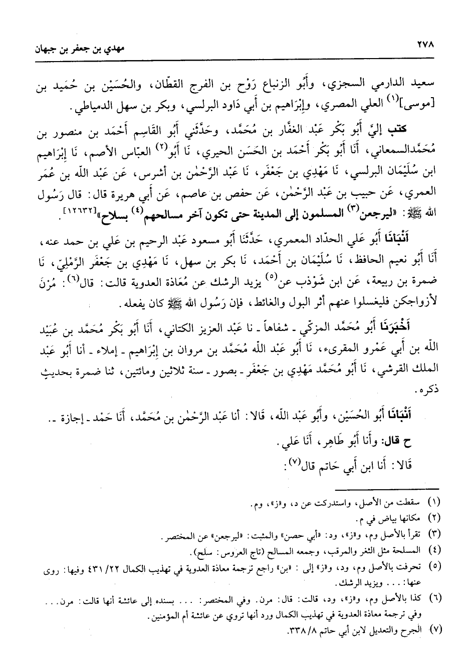 سعيد الدارمي السجزي وأبو الزنباع روح بن الفرج القطان والحسين بن حميد بن موسى (1) العلي المصري وإبراهيم بن أبي داود البرلسي وبكر بن سهل الدمياطي كتب إلي أبو بكر عبد الغفار بن محمد وحدثني أبو القاسم أحمد بن منصور بن محمد السمعاني أنا أبو بكر أحمد بن الحسن الحيري نا أبو (2) العباس الأصم نا إبراهيم ابن سليمان البرلسي نا مهدي بن جعفر نا عبد الرحمن بن أشرس عن عبد الله بن عمر العمري عن حبيب بن عبد الرحمن عن حفص بن عاصم عن أبي هريرة قال قال رسول الله (صلى الله عليه وسلم) ليرجعن (3) المسلمون إلى المدينة حتى تكون آخر مسالحهم (4) بسلاح أنبأنا أبو علي الحداد المعمري حدثنا أبو مسعود عبد الرحيم بن علي بن حمد عنه أنا أبو نعيم الحافظ نا سليمان بن أحمد نا بكر بن سهل نا مهدي بن جعفر الرملي نا ضمرة بن ربيعة عن ابن شوذب عن (5) يزيد الرشك عن معاذة العدوية قالت قال (6) مرن لأزواجكن فليغسلوا عنهم أثر البول والغائط فإن رسول الله (صلى الله عليه وسلم) كان يفعله أخبرنا أبو محمد المزكي شفاها نا عبد العزيز الكتاني أنا أبو بكر محمد بن عبيد الله بن أبي عمرو المقرئ نا أبو عبد الله محمد بن مروان بن إبراهيم إملاء أنا أبو عبد الملك القرشي نا أبو محمد مهدي بن جعفر بصور سنة ثلاثين ومائتين ثنا ضمرة بحديث ذكره أنبأنا أبو الحسين وأبو عبد الله قالا أنا عبد الرحمن بن محمد أنا حمد إجازة ح قال وأنا أبو طاهر أنا علي قالا أنا ابن أبي حاتم قال (7)