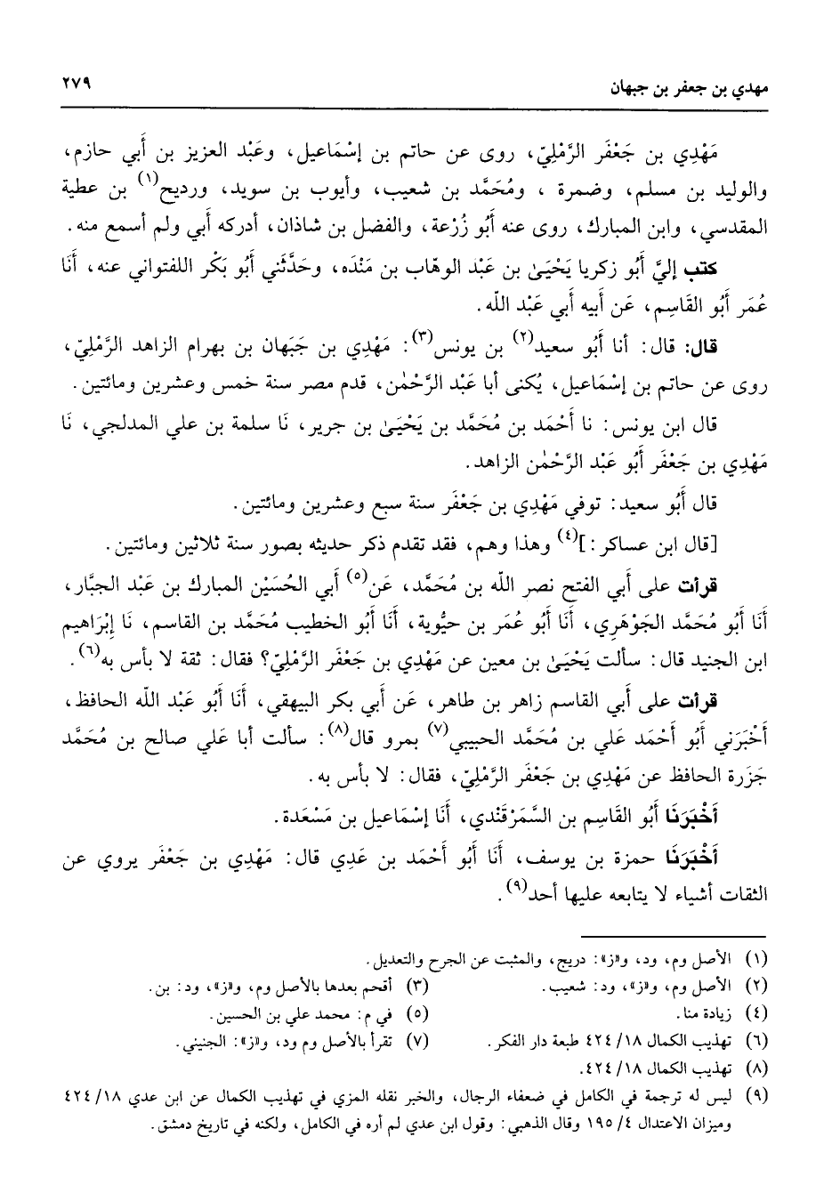 مهدي بن جعفر الرملي روى عن حاتم بن إسماعيل وعبد العزيز بن أبي حازم والوليد بن مسلم وضمرة ومحمد بن شعيب وأيوب بن سويد ورديح (1) بن عطية المقدسي وابن المبارك روى عنه أبو زرعة والفضل بن شاذان أدركه أبي ولم أسمع منه كتب إلي أبو زكريا يحيى بن عبد الوهاب بن منده وحدثني أبو بكر اللفتواني عنه أنا عمر أبو القاسم عن أبيه أبي عبد الله قال قال أنا أبو سعيد (2) بن يونس (3) مهدي بن جبهان بن بهرام الزاهد الرملي روى عن حاتم بن إسماعيل يكنى أبا عبد الرحمن قدم مصر سنة خمس وعشرين ومائتين قال ابن يونس نا أحمد بن محمد بن يحيى بن جرير نا سلمة بن علي المدلجي نا مهدي بن جعفر أبو عبد الرحمن الزاهد قال أبو سعيد توفي مهدي بن جعفر سنة سبع وعشرين ومائتين قال ابن عساكر (4) وهذا وهم فقد تقدم ذكر حديثه بصور سنة ثلاثين ومائتين قرأت على أبي الفتح نصر الله بن محمد عن (5) أبي الحسين المبارك بن عبد الجبار أنا أبو محمد الجوهري أنا أبو عمر بن حيوية أنا أبو الخطيب محمد بن القاسم نا إبراهيم ابن الجنيد قال سألت يحيى بن معين عن مهدي بن جعفر الرملي فقال ثقة لا بأس به (6) قرأت على أبي القاسم زاهر بن طاهر عن أبي بكر البيهقي أنا أبو عبد الله الحافظ أخبرني أبو أحمد علي بن محمد الحبيبي (7) بمرو قال (8) سألت أبا علي صالح بن محمد جزرة الحافظ عن مهدي بن جعفر الرملي فقال لا بأس به أخبرنا أبو القاسم بن السمرقندي أنا إسماعيل بن مسعدة أخبرنا حمزة بن يوسف أنا أبو أحمد بن عدي قال مهدي بن جعفر يروي عن الثقات أشياء لا يتابعه عليها أحد (9)