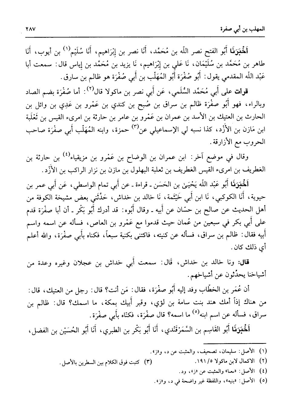 أخبرنا أبو الفتح نصر الله بن محمد أنا نصر بن إبراهيم أنا سليم (1) بن أيوب أنا طاهر بن محمد بن سليمان نا علي بن إبراهيم نا يزيد بن محمد بن إياس قال سمعت أبا عبد الله المقدمي يقول أبو صفرة أبو المهلب بن أبي صفرة هو ظالم بن سارق قرأت على أبي محمد السلمي عن أبي نصر بن ماكولا قال (2) أما صفرة بضم الصاد وبالراء فهو أبو صفرة ظالم بن سراق بن صبح بن كندي بن عمرو بن عدي بن وائل بن