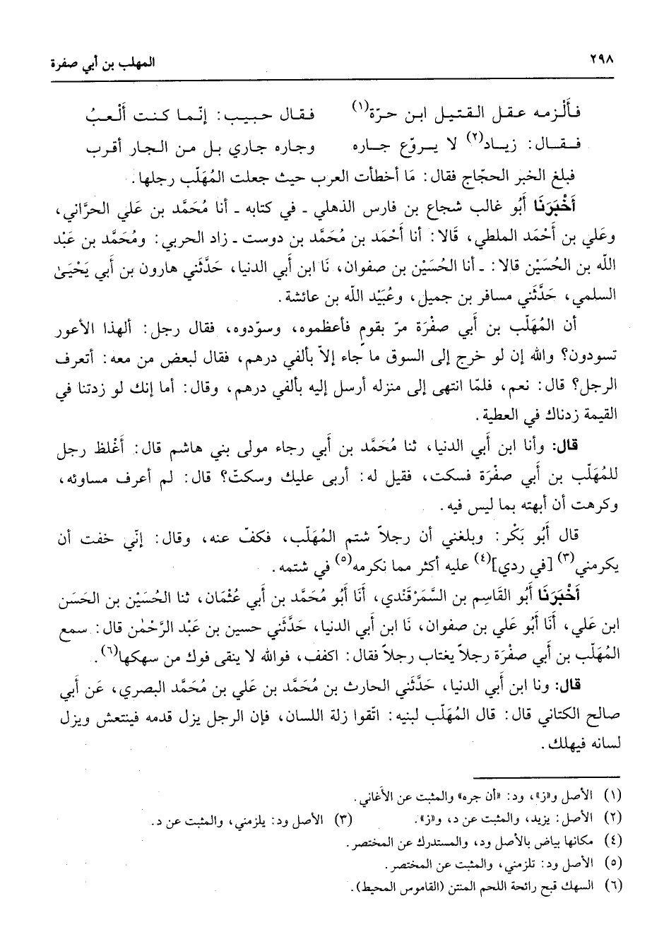 فألزمه عقل القتيل ابن حرة (1) * فقال حبيب إنما كنت ألعب فقال زياد (2) لا يروع جاره * وجاره جاري بل من الجار أقرب * فبلغ الخبر الحجاج فقال ما أخطأت العرب حيث جعلت المهلب رجلها أخبرنا أبو غالب شجاع بن فارس الذهلي في كتابه أنا محمد بن علي الحراني وعلي بن أحمد الملطي قالا أنا أحمد بن محمد بن دوست زاد الحربي ومحمد بن عبد الله بن الحسين قالا أنا الحسين بن صفوان نا ابن أبي الدنيا حدثني هارون بن أبي يحيى السلمي حدثني مسافر بن جميل وعبيد الله بن عائشة أن المهلب بن أبي صفرة مر بقوم فأعظموه وسودوه فقال رجل ألهذا الأعور تسودون والله إن لو خرج إلى السوق ما جاء إلا بألفي درهم فقال لبعض من معه أتعرف الرجل قال نعم فلما انتهى إلى منزله أرسل إليه بألفي درهم وقال أما إنك لو زدتنا في القيمة زدناك في العطية قال وأنا ابن أبي الدنيا ثنا محمد بن أبي رجاء مولى بني هاشم قال أغلظ رجل للمهلب بن أبي صفرة فسكت فقيل له أربى عليك وسكت قال لم أعرف مساوئه وكرهت أن أبهته بما ليس فيه قال أبو بكر وبلغني أن رجلا شتم المهلب فكف عنه وقال إني خفت أن يكرمني (3) في ردي (4) عليه أكثر مما نكرمه (5) في شتمه أخبرنا أبو القاسم بن السمرقندي أنا محمد بن أبي عثمان ثنا الحسين بن الحسن ابن علي أنا أبو علي بن صفوان نا ابن أبي الدنيا حدثني حسين بن عبد الرحمن قال سمع المهلب بن أبي صفرة رجلا يغتاب رجلا فقال اكفف فوالله لا ينقى فوك من سهكها (6) قال ونا ابن أبي الدنيا حدثني الحارث بن محمد بن علي بن محمد البصري عن أبي صالح الكتاني قال قال المهلب لبنيه اتقوا زلة اللسان فإن الرجل يزل قدمه فينتعش ويزل لسانه فيهلك