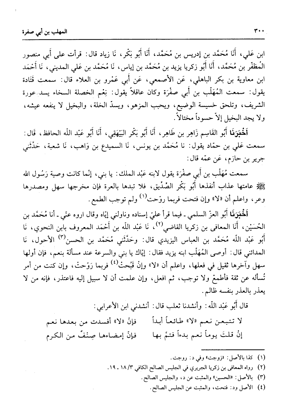 ابن علي أنا محمد بن إدريس بن محمد أنا أبو بكر نا زياد قال قرأت على أبي منصور المظفر بن محمد أنا أبو زكريا يزيد بن محمد بن إياس نا محمد بن علي المديني نا أحمد ابن معاوية بن بكر الباهلي عن الأصمعي عن أبي عمرو بن العلاء قال سمعت قتادة يقول سمعت المهلب بن أبي صفرة وكان عاقلا يقول نعم الخصلة السخاء يسد عورة الشريف وتلحق خسيسة الوضيع ويحبب المزهو ويسد الخلة والبخيل لا ينفعه عيشه ولا يجد البخيل إلا حسودا مختالا أخبرنا أبو القاسم زاهر بن طاهر أنا أبو بكر البيهقي أنا أبو عبد الله الحافظ قال سمعت علي بن حماد يقول نا محمد بن يونس نا السميدع بن واهب نا شعبة حدثني جرير بن حازم عن عمه قال سمعت مهلب بن أبي صفرة يقول لابنه عبد الملك يا بني إنما كانت وصية رسول الله (صلى الله عليه وسلم) عامتها عذاب أنفذها أبو بكر الصديق فلا تبدها بالعرة فإن مخرجها سهل ومصدرها وعر واعلم أن لا وإن فتحت فربما روحت (1) ولم توجب الطمع أخبرنا أبو العز السلمي فيما قرأ علي إسناده وناولني إياه وقال اروه عني أنا محمد بن الحسين أنا المعافى بن زكريا القاضي (2) نا عبد الله بن أحمد المعروف بابن النحوي نا أبو عبد الله محمد بن العباس اليزيدي قال وحدثني محمد بن الحسن (3) الأحول نا المدائني قال أوصى المهلب ابنه يزيد فقال إياك يا بني والسرعة عند مسألة بنعم فإن أولها سهل وآخرها ثقيل في فعلها واعلم أن لا وإن قبحت (4) فربما روحت وإن كنت من أمر تسأله عن ثقة فأطمع ولا توجب ثم افعل وأنا علمت أن لا سبيل إليه فاعتذر فإنه من لا يعذر بالعذر بنفسه ظالم قال أبو عبد الله وأنشدنا ثعلب قال أنشدني ابن الأعرابي * لا تتبعن نعم لا طائعا أبدا * فإن لا أفسدت من بعدها نعم إن قلت يوما نعم بدءا فتم لها * فإن إمضاءها صنف من الكرم *