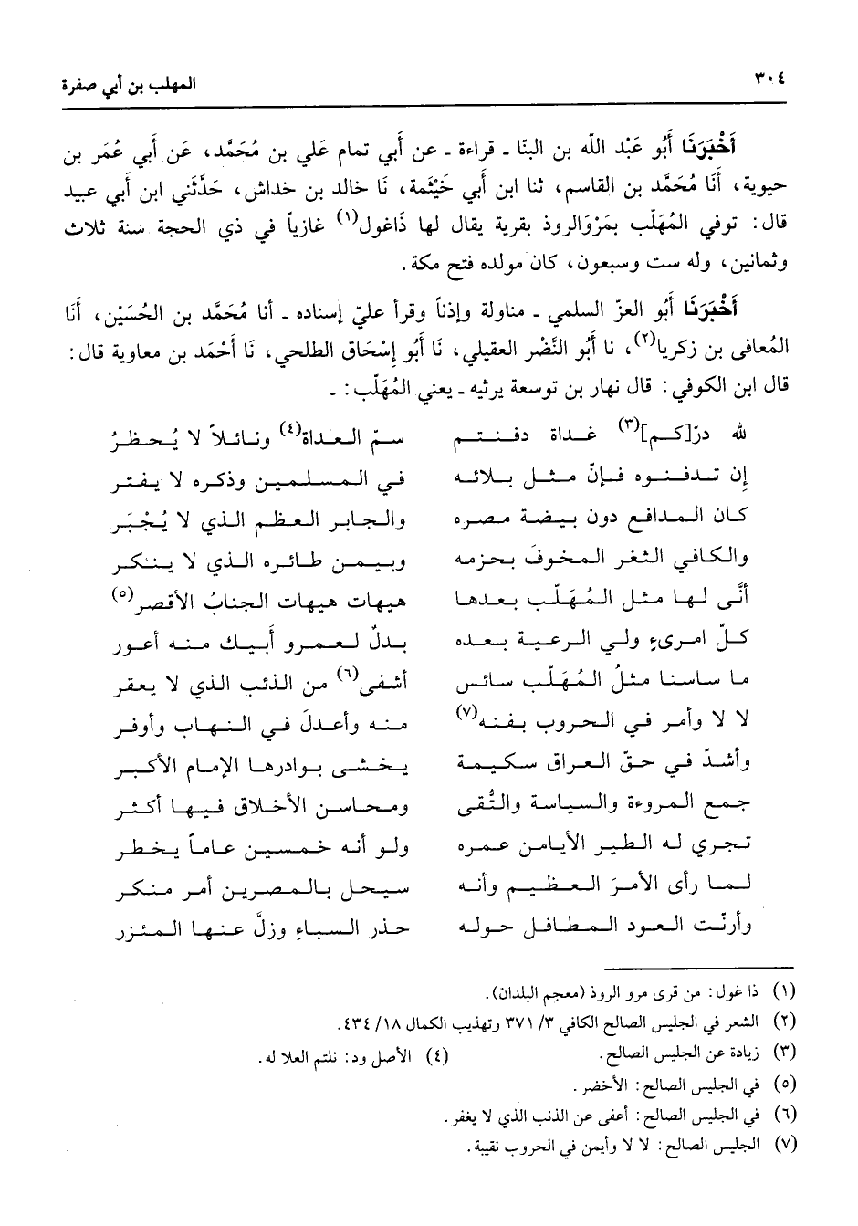 أخبرنا أبو عبد الله بن البنا قراءة عن أبي تمام علي بن محمد عن أبي عمر بن حيوية أنا محمد بن القاسم ثنا ابن أبي خيثمة نا خالد بن خداش حدثني ابن أبي عبيد قال توفي المهلب بمروالروذ بقرية يقال لها ذاغول (1) غازيا في ذي الحجة سنة ثلاث وثمانين وله ست وسبعون كان مولده فتح مكة أخبرنا أبو العز السلمي مناولة وإذنا وقرأ علي إسناده أنا محمد بن الحسين أنا المعافى بن زكريا (2) نا أبو النضر العقيلي نا أبو إسحاق الطلحي نا أحمد بن معاوية قال قال ابن الكوفي قال نهار بن توسعة يرثيه يعني المهلب * لله دركم (3) غداة دفنتم * سم العداة (4) ونائلا لا يحظر إن تدفنوه فإن مثل ببلائه * في المسلمين وذكره لا يفتر * * كان المدافع دون بيضة مصره * والجابر العظم الذي لا يجبر والكافي الثغر المخوف بحزمه * وبيمن طائره الذي لا ينكر أنى لها مثل المهلب بعدها * هيهات هيهات الجناب الأقصر (5) كل امرئ ولي الرعية بعده * بدل لعمرو أبيك منه أعور ما ساسنا مثل المهلب سائس * أشفى (6) من الذئب الذي لا يعقر لا لا وأمر في الحروب بفنه (7) * منه وأعدل في النهاب وأوفر وأشد في حق العراق سكيمة * يخشى بوادرها الإمام الأكبر جمع المروءة والسياسة والتقى * ومحاسن الأخلاق فيها أكثر تجري له الطير الأيامن عمره * ولو أنه خمسين عاما يخطر لما رأى الأمر العظيم وأنه * سيحل بالمصرين أمر منكر وأرنت العود المطافل حوله * حذر السباء وزل عنها المئزر