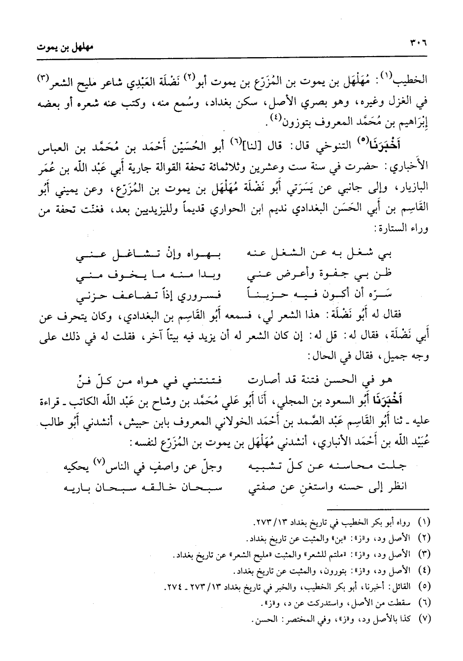 الخطيب (1) مهلهل بن يموت بن المزرع بن يموت أبو (2) نضلة العبدي شاعر مليح الشعر (3) في الغزل وغيره وهو بصري الأصل سكن بغداد وسمع منه وكتب عنه شعره أو بعضه إبراهيم بن محمد المعروف بتوزون (4) أخبرنا (5) التنوخي قال قال لنا (6) أبو الحسين أحمد بن محمد بن العباس الأخباري حضرت في سنة ست وعشرين وثلاثمائة تحفة القوالة جارية أبي عبد الله بن عمر البازيار وإلى جانبي عن يسرتي أبو نضلة مهلهل بن يموت بن المزرع وعن يميني أبو القاسم بن أبي الحسن البغدادي نديم ابن الحواري قديما ولليزيديين بعد فغنت تحفة من وراء الستارة * بي شغل به عن الشغل عنه * بهواه وإن تشاغل عني ظن بي جفوة وأعرض عني * وبدا منه ما يخوف مني * * سره أن أكون فيه حزينا * فسروري إذا تضاعف حزني * فقال له أبو نضلة هذا الشعر لي فسمعه أبو القاسم بن البغدادي وكان يتحرف عن أبي نضلة فقال له قل له إن كان الشعر له أن يزيد فيه بيتا آخر فقلت له في ذلك على وجه جميل فقال في الحال * هو في الحسن فتنة قد أصارت * فتنتني في هواه من كل فن * أخبرنا أبو السعود بن المجلي أنا أبو علي محمد بن وشاح بن عبد الله الكاتب قراءة عليه ثنا أبو القاسم عبد الصمد بن أحمد الخولاني المعروف بابن حبيش أنشدني أبو طالب عبيد الله بن أحمد الأنباري أنشدني مهلهل بن يموت بن المزرع لنفسه * جلت محاسنه عن كل تشبيه * وجل عن واصف في الناس (7) يحكيه انظر إلى حسنه واستغن عن صفتي * سبحان خالقه سبحان باريه