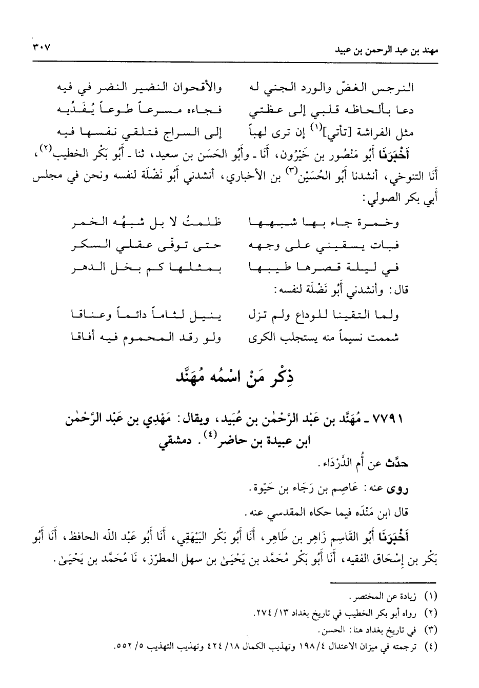 7791 - مهند بن عبد الرحمن بن عبيد ويقال مهدي بن عبد الرحمن ابن عبيدة بن حاضر (4) دمشقي حدث عن أم الدرداء روى عنه عاصم بن رجاء بن حيوة قال ابن مندة فيما حكاه المقدسي عنه أخبرنا أبو القاسم زاهر بن طاهر أنا أبو بكر البيهقي أنا أبو عبد الله الحافظ أنا أبو بكر بن إسحاق الفقيه أنا أبو بكر محمد بن يحيى بن سهل المطرز نا محمد بن يحيى