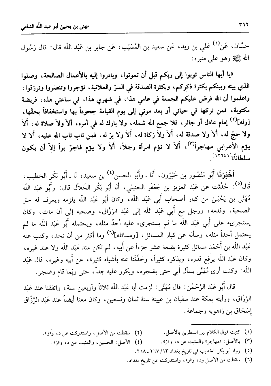 حسان عن (1) علي بن زيد عن سعيد بن المسيب عن جابر بن عبد الله قال قال رسول الله (صلى الله عليه وسلم) وهو على منبره يا أيها الناس توبوا إلى ربكم قبل أن تموتوا وبادروا إليه بالأعمال الصالحة وصلوا الذي بينه وبينكم بكثرة ذكركم وبكثرة الصدقة في السر والعلانية تؤجروا وتنصروا وترزقوا واعلموا أن الله فرض عليكم الجمعة في عامي هذا في شهري هذا في ساعتي هذه فريضة مكتوبة فمن تركها في حياتي أو بعد موتي إلى يوم القيامة جحودا بها واستخفافا بحقها وله (2) إمام عادل أو جائر فلا جمع الله شمله ولا بارك له في أمره ألا ولا صلاة له ألا ولا حج له ألا ولا صدقة له ألا ولا زكاة له ألا ولا بر له فمن تاب تاب الله عليه ألا لا يؤم الأعرابي مهاجرا (3) ألا لا تؤم امرأة رجلا ألا ولا يؤم فاجر برا إلا أن يكون سلطانا أخبرنا أبو منصور بن خيرون أنا وأبو الحسن (4) بن سعيد نا أبو بكر الخطيب قال (5) حدثت عن عبد العزيز بن جعفر الحنبلي أنا أبو بكر الخلال قال وأبو عبد الله مهنى بن يحيى من كبار أصحاب أبي عبد الله وكان أبو عبد الله يلزمه ويعرف له حق الصحبة وقدمه ورجل مع أبي عبد الله إلى عبد الرزاق وصحبه إلى أن مات وكان يستجرئ على أبي عبد الله ما لم يستجرئ عليه أحد مثله ويحتمله أبو عبد الله ما لم يحتمل أحدا مثله وسأله عن كبار المسائل ومسائله (6) وما أكثر من أن تحد وكتب عنه عبد الله بن أحمد مسائل كثيرة بضعة عشر جزءا عن أبيه لم تكن عند عبد الله ولا عند غيره وكان عبد الله يرفع قدره ويذكره كثيرا وحدثنا عنه بأشياء كثيرة عن أبيه وغيره قال عبد الله وكنت أرى مهنى يسأل أبي حتى يضجره ويكرر عليه جدا حتى ربما قام وضجر قال أبو عبد الرحمن قال مهنى لزمت أبا عبد الله ثلاثا وأربعين سنة واتفقنا عند عبد الرزاق ورأيته بمكة عند سفيان بن عيينة سنة ثمان وتسعين وكان معنا أيضا عند عبد الرزاق إسحاق بن راهويه وجماعة