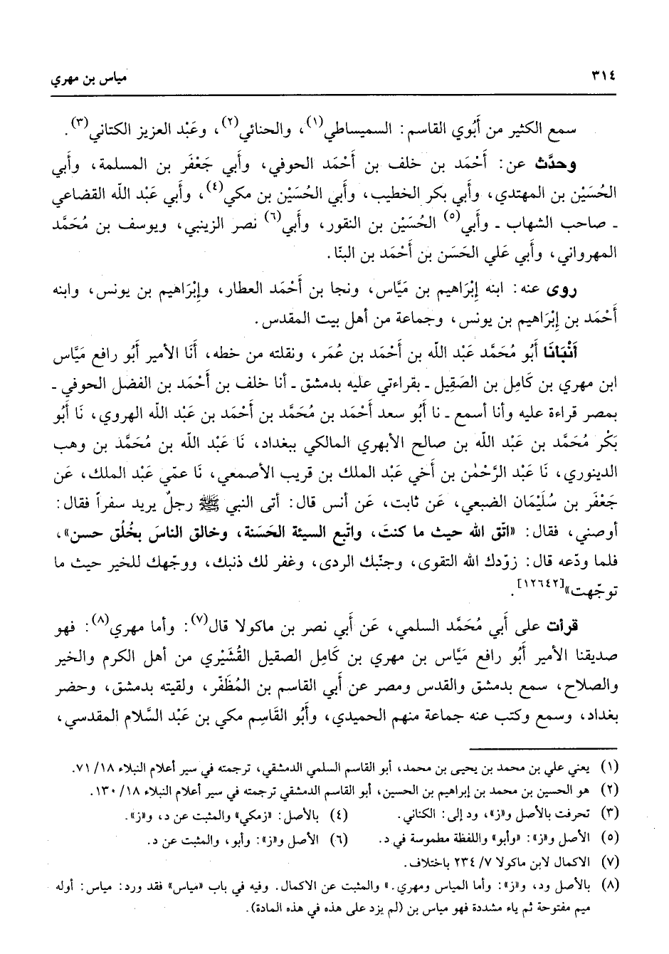 سمع الكثير من أبوي القاسم السميساطي (1) والحنائي (2) وعبد العزيز الكتاني (3) وحدث عن أحمد بن خلف بن أحمد الحوفي وأبي جعفر بن المسلمة وأبي الحسين بن المهتدي وأبي بكر الخطيب وأبي الحسين بن مكي (4) وأبي عبد الله القضاعي صاحب الشهاب وأبي (5) الحسين بن النقور وأبي (6) نصر الزينبي ويوسف بن محمد المهرواني وأبي علي الحسن بن أحمد بن البنا روى عنه ابنه إبراهيم بن نمياس ونجا بن أحمد العطار وإبراهيم بن يونس وابنه أحمد بن إبراهيم بن يونس وجماعة من أهل بيت المقدس أنبأنا أبو محمد عبد الله بن أحمد بن عمر ونقلته من خطه أنا الأمير أبو رافع مياس ابن مهري بن كامل بن الصقيل بقراءتي عليه بدمشق أنا خلف بن أحمد بن الفضل الحوفي بمصر قراءة عليه وأنا أسمع نا أبو سعد أحمد بن محمد بن أحمد بن عبد الله الهروي نا أبو بكر محمد بن عبد الله بن صالح الأبهري المالكي ببغداد نا عبد الله بن محمد بن وهب الدينوري نا عبد الرحمن بن أخي عبد الملك بن قريب الأصمعي نا عمي عبد الملك عن جعفر بن سليمان الضبعي عن ثابت عن أنس قال أتى النبي (صلى الله عليه وسلم) رجل يريد سفرا فقال أوصني فقال اتق الله حيث ما كنت واتبع السيئة الحسنة وخالق الناس بخلق حسن فلما ودعه قال زودك الله التقوى وجنبك الردى وغفر لك ذنبك ووجهك للخير حيث ما توجهت قرأت على أبي محمد السلمي عن أبي نصر بن ماكولا قال (7) وأما مهري (8) فهو صديقنا الأمير أبو رافع مياس بن مهري بن كامل الصقيل القشيري من أهل الكرم والخير والصلاح سمع بدمشق والقدس ومصر عن أبي القاسم بن المظفر ولقيته بدمشق وحضر بغداد وسمع وكتب عنه جماعة منهم الحميدي وأبو القاسم مكي بن عبد السلام المقدسي