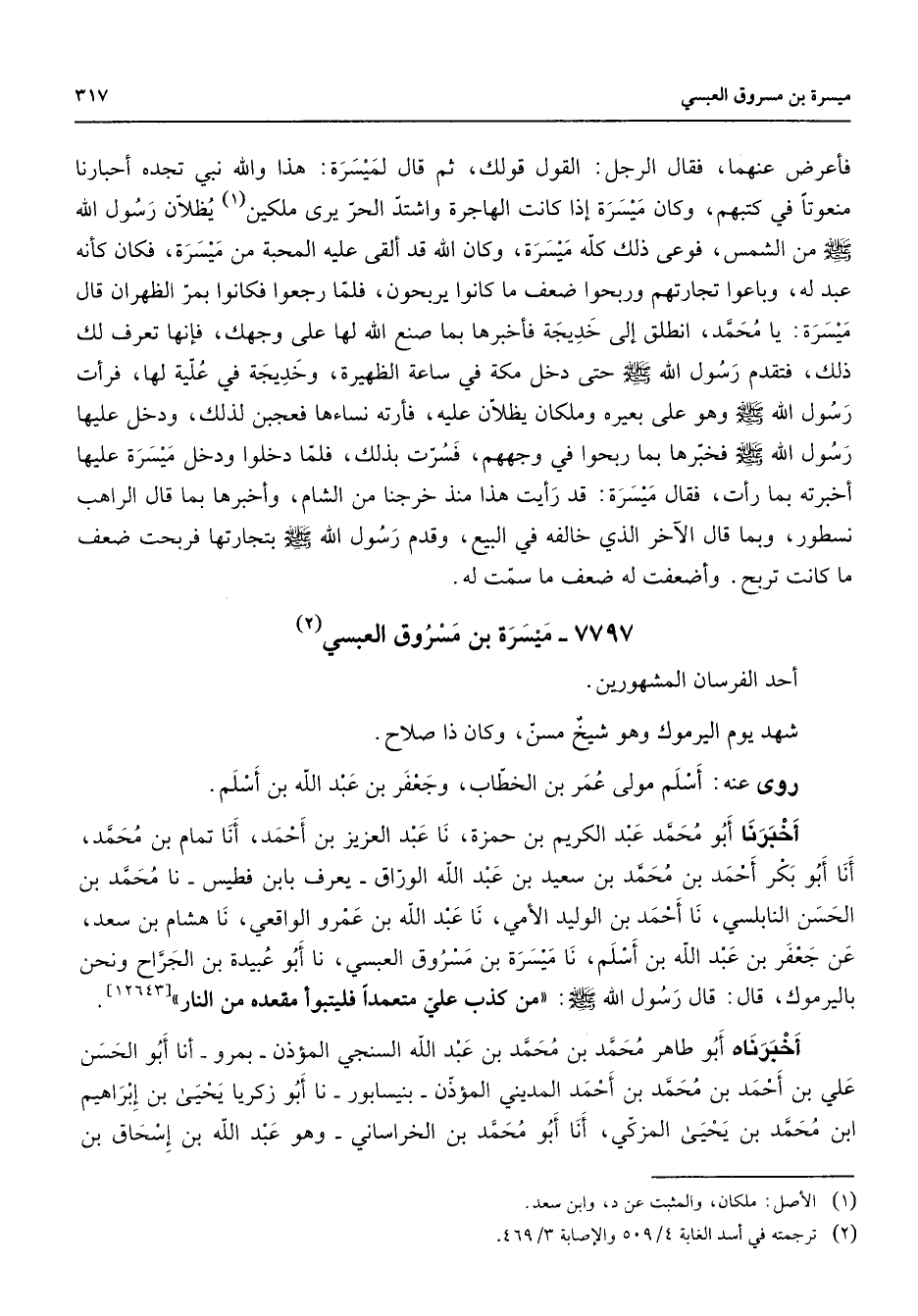 7797 - ميسرة بن مسروق العبسي (2) أحد الفرسان المشهورين شهد يوم اليرموك وهو شيخ مسن وكان ذا صلاح روى عنه أسلم مولى عمر بن الخطاب وجعفر بن عبد الله بن أسلم أخبرنا أبو محمد عبد الكريم بن حمزة نا عبد العزيز بن أحمد أنا تمام بن محمد أنا أبو بكر أحمد بن محمد بن سعيد بن عبد الله الوراق يعرف بابن فطيس نا محمد بن الحسن النابلسي نا أحمد بن الوليد الأمي نا عبد الله بن عمرو الواقعي نا هشام بن سعد عن جعفر بن عبد الله بن أسلم نا ميسرة بن مسروق العبسي نا أبو عبيدة بن الجراح ونحن باليرموك قال قال رسول الله (صلى الله عليه وسلم) من كذب علي متعمدا فليتبوأ مقعده من النار أخبرناه أبو طاهر محمد بن محمد بن عبد الله السنجي المؤذن بمرو أنا أبو الحسن علي بن أحمد بن محمد بن أحمد المديني المؤذن بنيسابور نا أبو زكريا يحيى بن إبراهيم ابن محمد بن يحيى المزكي أنا أبو محمد بن الخراساني وهو عبد الله بن إسحاق بن