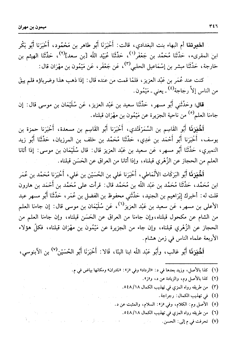 أخبرتنا أم البهاء بنت البغدادي قالت أخبرنا أبو طاهر بن محمود أخبرنا أبو بكر ابن المقرئ حدثنا محمد بن جعفر (1) حدثنا عبيد الله بن سعد (2) حدثنا الهيثم بن خارجة حدثنا مبشر بن إسماعيل الحلبي (3) عن جعفر عن ميمون بن مهران قال كنت عند عمر بن عبد العزيز فلما قمت من عنده قال إذا ذهب هذا وضرباؤه فلم يبق من الناس إلا رجاجة (4) يعني ميمون قال وحدثني أبو مسهر حدثنا سعيد بن عبد العزيز عن سليمان بن موسى قال إن جاءنا العلم (5) من ناحية الجزيرة عن ميمون بن مهران قبلناه أخبرنا أبو القاسم بن السمرقندي أخبرنا أبو القاسم بن مسعدة أخبرنا حمزة بن يوسف أخبرنا أبو أحمد بن عدي حدثنا محمد بن خلف بن المرزبان حدثنا أبو زيد النميري حدثنا أبو مسهر عن سعيد بن عبد العزيز قال قال سليمان بن موسى إذا أتانا العلم من الحجاز عن الزهري قبلناه وإذا أتانا من العراق عن الحسن قبلناه أخبرنا أبو البركات الأنماطي أخبرنا علي بن الحسين بن علي أخبرنا محمد بن عمر ابن محمد حدثنا محمد بن عبد الله بن محمد قال قرأت على محمد بن أحمد بن هارون قلت له أخبرك إبراهيم بن الجنيد حدثني محفوظ بن الفضل بن عمر حدثنا أبو مسهر عبد الأعلى بن مسهر عن سعيد بن عبد العزيز (6) عن سليمان بن موسى قال إن جاءنا العلم من الشام عن مكحول قبلناه وإن جاءنا من العراق عن الحسن قبلناه وإن جاءنا العلم من الحجاز عن الزهري قبلناه وإن جاء من الجزيرة عن ميمون بن مهران قبلناه فكل هؤلاء الأربعة علماء الناس في زمن هشام أخبرنا أبو غالب وأبو عبد الله ابنا البنا قالا أخبرنا أبو الحسين (7) بن الآبنوسي