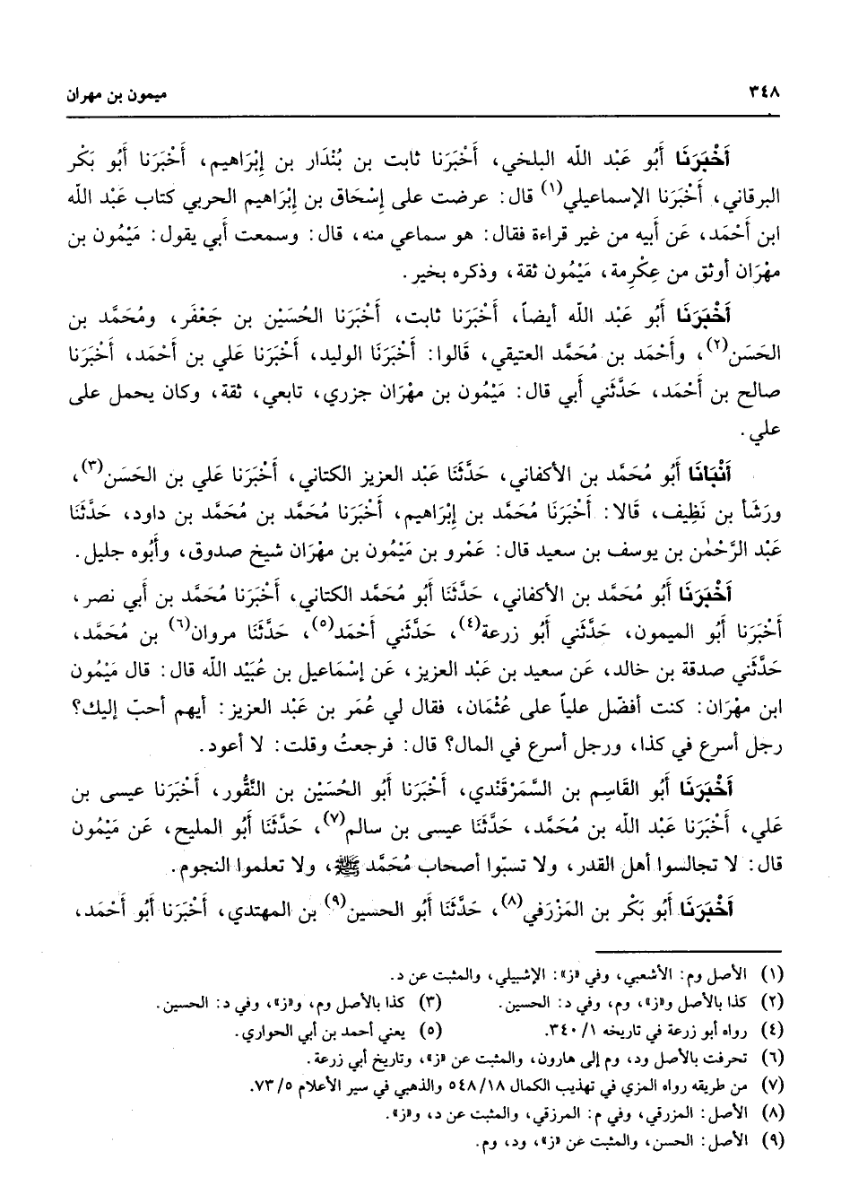 أخبرنا أبو عبد الله البلخي أخبرنا ثابت بن بندار بن إبراهيم أخبرنا أبو بكر البرقاني أخبرنا الإسماعيلي (1) قال عرضت على إسحاق بن إبراهيم الحربي كتاب عبد الله ابن أحمد عن أبيه من غير قراءة فقال هو سماعي منه قال وسمعت أبي يقول ميمون بن مهران أوثق من عكرمة ميمون ثقة وذكره بخير أخبرنا أبو عبد الله أيضا أخبرنا ثابت أخبرنا الحسين بن جعفر ومحمد بن الحسن (2) وأحمد بن محمد العتيقي قالوا أخبرنا الوليد أخبرنا علي بن أحمد أخبرنا صالح بن أحمد حدثني أبي قال ميمون بن مهران جزري تابعي ثقة وكان يحمل على علي أنبأنا أبو محمد بن الأكفاني حدثنا عبد العزيز الكتاني أخبرنا علي بن الحسن (3) ورشأ بن نظيف قالا أخبرنا محمد بن إبراهيم أخبرنا محمد بن محمد بن داود حدثنا عبد الرحمن بن يوسف بن سعيد قال عمرو بن ميمون بن مهران شيخ صدوق وأبوه جليل أخبرنا أبو محمد بن الأكفاني حدثنا أبو محمد الكتاني أخبرنا محمد بن أبي نصر أخبرنا أبو الميمون حدثني أبو زرعة (4) حدثني أحمد (5) حدثنا مروان (6) بن محمد حدثني صدقة بن خالد عن سعيد بن عبد العزيز عن إسماعيل بن عبيد الله قال قال ميمون ابن مهران كنت أفضل عليا على عثمان فقال لي عمر بن عبد العزيز أيهم أحب إليك رجل أسرع في كذا ورجل أسرع في المال قال فرجعت وقلت لا أعود أخبرنا أبو القاسم بن السمرقندي أخبرنا أبو الحسين بن النقور أخبرنا عيسى بن علي أخبرنا عبد الله بن محمد حدثنا عيسى بن سالم (7) حدثنا أبو المليح عن ميمون قال لا تجالسوا أهل القدر ولا تسبوا أصحاب محمد (صلى الله عليه وسلم) ولا تعلموا النجوم أخبرنا أبو بكر بن المزرفي (8) حدثنا أبو الحسين (9) بن المهتدي أخبرنا أبو أحمد