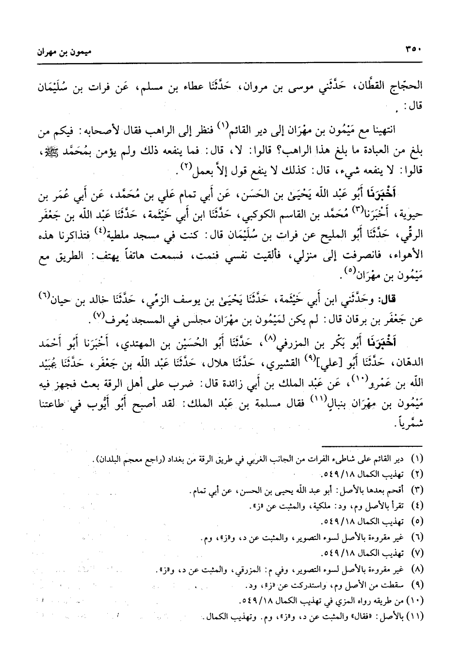 الحجاج القطان حدثني موسى بن مروان حدثنا عطاء بن مسلم عن فرات بن سليمان قال انتهينا مع ميمون بن مهران إلى دير القائم (1) فنظر إلى الراهب فقال لأصحابه فيكم من بلغ من العبادة ما بلغ هذا الراهب قالوا لا قال فما ينفعه ذلك ولم يؤمن بمحمد (صلى الله عليه وسلم) قالوا لا ينفعه شئ قال كذلك لا ينفع قول إلا بعمل (2) أخبرنا أبو عبد الله يحيى بن الحسن عن أبي تمام علي بن محمد عن أبي عمر بن حيوية أخبرنا (3) محمد بن القاسم الكوكبي حدثنا ابن أبي خيثمة حدثنا عبد الله بن جعفر الرقي حدثنا أبو المليح عن فرات بن سليمان قال كنت في مسجد ملطية (4) فتذاكرنا هذه الأهواء فانصرفت إلى منزلي فألقيت نفسي فنمت فسمعت هاتفا يهتف الطريق مع ميمون بن مهران (5) قال وحدثني ابن أبي خيثمة حدثنا يحيى بن يوسف الزمي حدثنا خالد بن حيان (6) عن جعفر بن برقان قال لم يكن لميمون بن مهران مجلس في المسجد يعرف (7) أخبرنا أبو بكر بن المزرفي (8) حدثنا أبو الحسين بن المهتدي أخبرنا أبو أحمد الدهان حدثنا أبو علي (9) القشيري حدثنا هلال حدثنا عبد الله بن جعفر حدثنا عبيد الله بن عمرو (10) عن عبد الملك بن أبي زائدة قال ضرب على أهل الرقة بعث فجهز فيه ميمون بن مهران بنبال (11) فقال مسلمة بن عبد الملك لقد أصبح أبو أيوب في طاعتنا شمريا