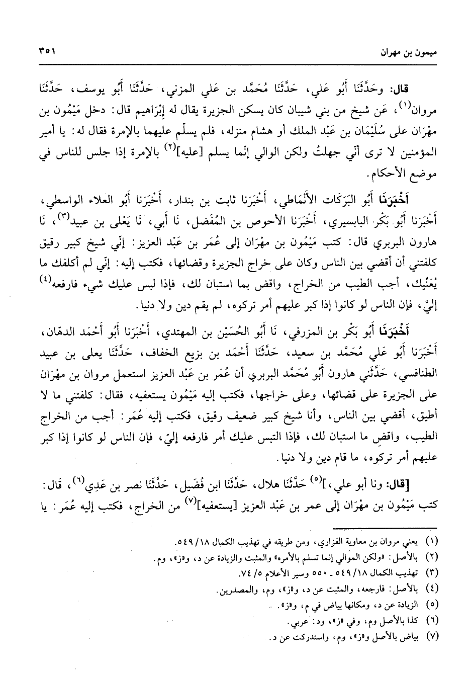 قال وحدثنا أبو علي حدثنا محمد بن علي المزني حدثنا أبو يوسف حدثنا مروان (1) عن شيخ من بني شيبان كان يسكن الجزيرة يقال له إبراهيم قال دخل ميمون بن مهران على سليمان بن عبد الملك أو هشام منزله فلم يسلم عليهما بالإمرة فقال له يا أمير المؤمنين لا ترى أني جهلت ولكن الوالي إنما يسلم عليه (2) بالإمرة إذا جلس للناس في موضع الأحكام أخبرنا أبو البركات الأنماطي أخبرنا ثابت بن بندار أخبرنا أبو العلاء الواسطي أخبرنا أبو بكر البابسيري أخبرنا الأحوص بن المفضل نا أبي نا يعلى بن عبيد (3) نا هارون البربري قال كتب ميمون بن مهران إلى عمر بن عبد العزيز إني شيخ كبير رقيق كلفتني أن أقضي بين الناس وكان على خراج الجزيرة وقضائها فكتب إليه إني لم أكلفك ما يعنيك أجب الطيب من الخراج واقض بما استبان لك فإذا لبس عليك فارفعه (4) إلي فإن الناس لو كانوا إذا كبر عليهم أمر تركوه لم يقم دين ولا دنيا أخبرنا أبو بكر بن المزرفي نا أبو الحسين بن المهتدي أخبرنا أبو أحمد الدهان أخبرنا أبو علي محمد بن سعيد حدثنا أحمد بن بزيع الخفاف حدثنا يعلى بن عبيد الطنافسي حدثني هارون أبو محمد البربري أن عمر بن عبد العزيز استعمل مروان بن مهران على الجزيرة على قضائها وعلى خراجها فكتب إليه ميمون يستعفيه فقال كلفتني ما لا أطيق أقضي بين الناس وأنا شيخ كبير ضعيف رقيق فكتب إليه عمر أجب من الخراج الطيب واقض ما استبان لك فإذا التبس عليك أمر فارفعه إلي فإن الناس لو كانوا إذا كبر عليهم أمر تركوه ما قام دين ولا دنيا قال ونا أبو علي (5) حدثنا هلال حدثنا ابن فضيل حدثنا نصر بن عدي (6) قال كتب ميمون بن مهران إلى عمر بن عبد العزيز يستعفيه (7) من الخراج فكتب إليه عمر يا