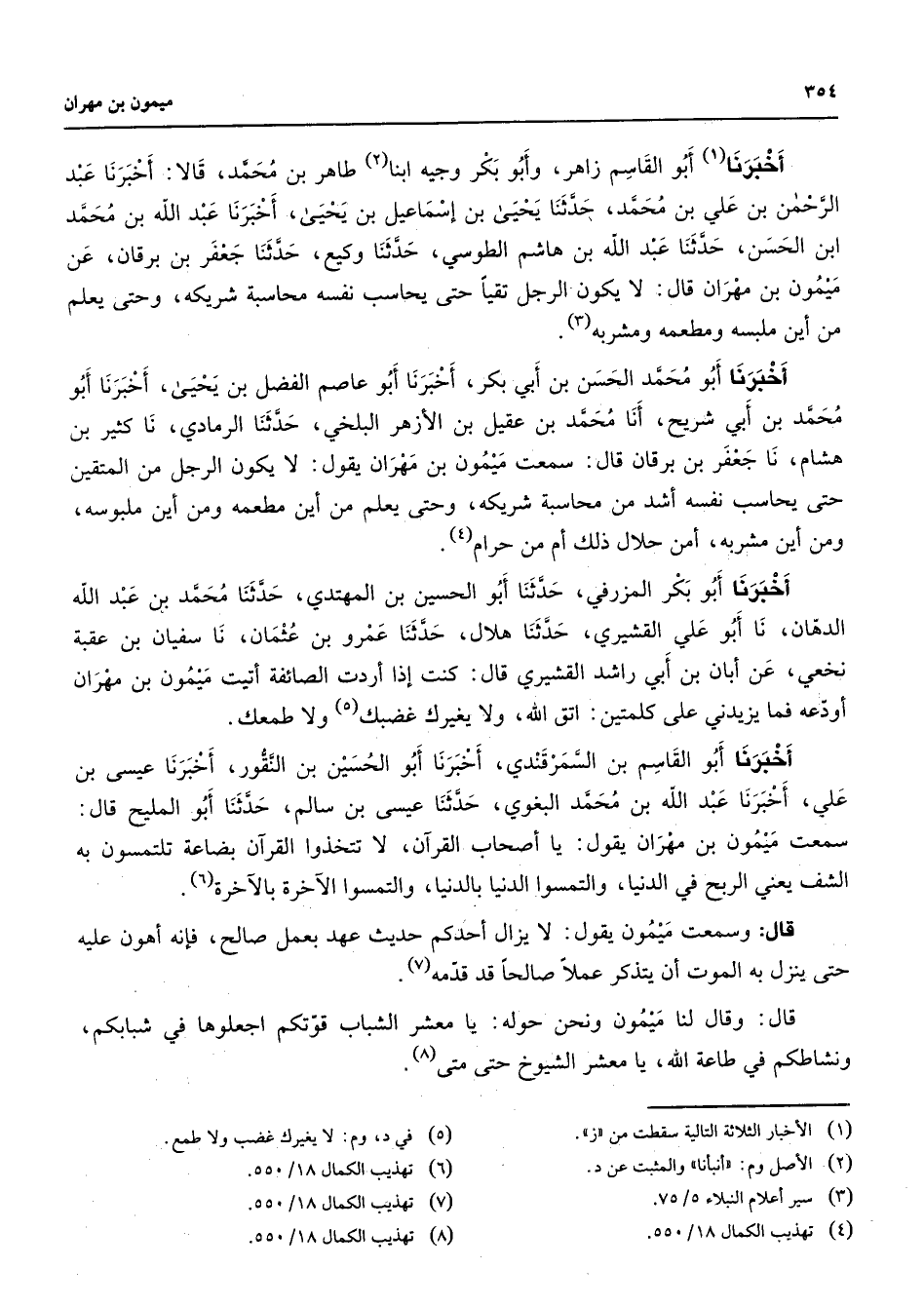 أخبرنا (1) أبو القاسم زاهر وأبو بكر وجيه ابنا (2) طاهر بن محمد قالا أخبرنا عبد الرحمن بن علي بن محمد حدثنا يحيى بن إسماعيل بن يحيى أخبرنا عبد الله بن محمد ابن الحسن حدثنا عبد الله بن هاشم الطوسي حدثنا وكيع حدثنا جعفر بن برقان عن ميمون بن مهران قال لا يكون الرجل تقيا حتى يحاسب نفسه محاسبة شريكه وحتى يعلم من أين ملبسه ومطعمه ومشربه (3) أخبرنا أبو محمد الحسن بن أبي بكر أخبرنا أبو عاصم الفضل بن يحيى أخبرنا أبو محمد بن أبي شريح أنا محمد بن عقيل بن الأزهر البلخي حدثنا الرمادي نا كثير بن هشام نا جعفر بن برقان قال سمعت ميمون بن مهران يقول لا يكون الرجل من المتقين حتى يحاسب نفسه أشد من محاسبة شريكه وحتى يعلم من أين مطعمه ومن أين ملبوسه ومن أين مشربه أمن حلال ذلك أم من حرام (4) أخبرنا أبو بكر المزرفي حدثنا أبو الحسين بن المهتدي حدثنا محمد بن عبد الله الدهان نا أبو علي القشيري حدثنا هلال حدثنا عمرو بن عثمان نا سفيان بن عقبة نخعي عن أبان بن أبي راشد القشيري قال كنت إذا أردت الصائفة أتيت ميمون بن مهران أودعه فما يزيدني عن كلمتين اتق الله ولا يغيرك غضبك (5) ولا طمعك أخبرنا أبو القاسم بن السمرقندي أخبرنا أبو الحسين بن النقور أخبرنا عيسى بن علي أخبرنا عبد الله بن محمد البغوي حدثنا عيسى بن سالم حدثنا أبو المليح قال سمعت ميمون بن مهران يقول يا أصحاب القرآن لا تتخذوا القرآن بضاعة تلتمسون به الشف يعني الربح في الدنيا والتمسوا الدنيا بالدنيا والتمسوا الآخرة بالآخرة (6) قال وسمعت ميمون يقول لا يزال أحدكم حديث عهد بعمل صالح فإنه أهون عليه حتى ينزل به الموت أن يتذكر عملا صالحا قد قدمه (7) قال وقال لنا ميمون ونحن حوله يا معشر الشباب قوتكم اجعلوها في شبابكم ونشاطكم في طاعة الله يا معشر الشيوخ حتى متى (8)