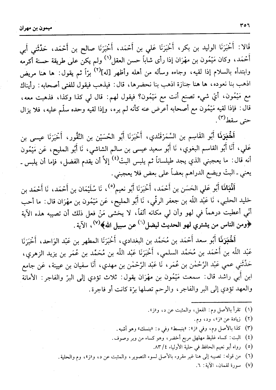 أنه قال ما يعجبني الذي يجد طيلسانا ثم يلبس البت (4) إلا أن يقدم الفضل فإما أن يلبس يعني البت ويضع الدراهم بعضا على بعض فلا يعجبني أنبأنا أبو علي الحسن بن أحمد أخبرنا أبو نعيم (5) نا سليمان بن أحمد نا أحمد بن خليد الحلبي نا عبد الله بن جعفر الرقي نا أبو المليح عن ميمون بن مهران أنه قال ما أحب أني أعطيت درهما في لهو وأن لي مكانه ألفا لا يخشى من فعل ذلك أن تصيبه هذه الآية " ومن الناس من يشتري لهو الحديث ليضل (6) عن سبيل الله " (7) الآية أخبرنا أبو سعد أحمد بن محمد بن البغدادي أخبرنا المطهر بن عبد الواحد أخبرنا عبد الله بن أحمد بن محمد السلمي أخبرنا عبد الله بن محمد بن عمر بن يزيد الزهري حدثني عمي عبد الرحمن بن عمر نا عبد الرحمن بن مهدي أنا سفيان بن عيينة عن جامع ابن أبي راشد قال سمعت ميمون بن مهران يقول ثلاث تؤدي إلى البر والفاجر الأمانة والعهد تؤدي إلى البر والفاجر والرحم تصلها برة كانت أو فاجرة
