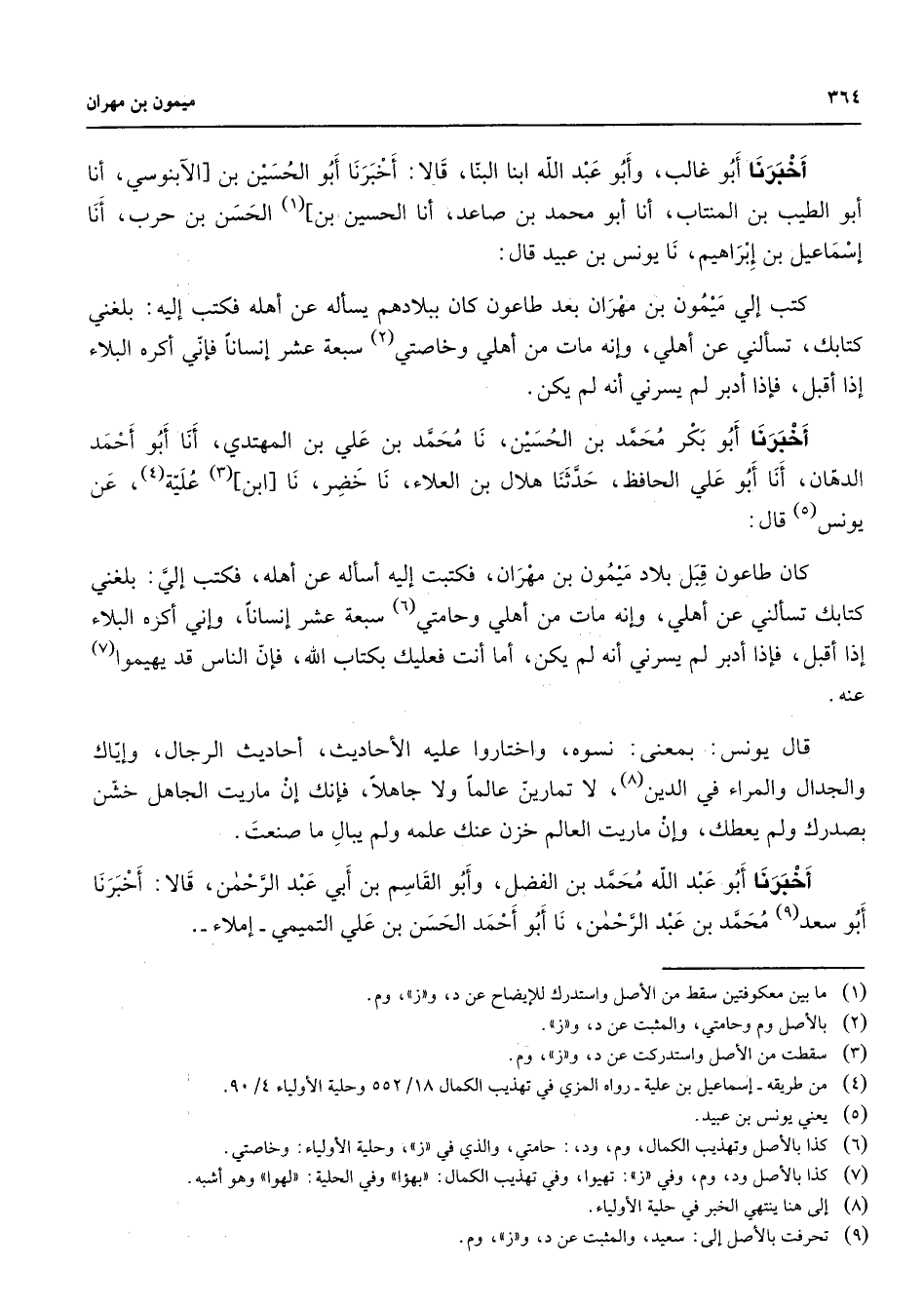 أخبرنا أبو غالب وأبو عبد الله ابنا البنا قالا أخبرنا أبو الحسين بن الآبنوسي أنا أبو الطيب بن المنتاب أنا أبو محمد بن صاعد أنا الحسين بن (1) الحسن بن حرب أنا إسماعيل بن إبراهيم نا يونس بن عبيد قال كتب إلي ميمون بن مهران بعد طاعون كان ببلادهم يسأله عن أهله فكتب إليه بلغني كتابك تسألني عن أهلي وإنه مات من أهلي وخاصتي (2) سبعة عشر إنسانا فإني أكره البلاء إذا أقبل فإذا أدبر لم يسرني أنه لم يكن أخبرنا أبو بكر محمد بن الحسين نا محمد بن علي بن المهتدي أنا أبو أحمد الدهان أنا أبو علي الحافظ حدثنا هلال بن العلاء نا خضر نا ابن (3) علية (4) عن يونس (5) قال كان طاعون قبل بلاد ميمون بن مهران فكتبت إليه أسأله عن أهله فكتب إلي بلغني كتابك تسألني عن أهلي وإنه مات من أهلي وحامتي (6) سبعة عشر إنسانا وإني أكره البلاء إذا أقبل فإذا أدبر لم يسرني أنه لم يكن أما أنت فعليك بكتاب الله فإن الناس قد يهيموا (7) عنه قال يونس بمعنى نسوه واختاروا عليه الأحاديث احاديث الرجال وإياك والجدال والمراء في الدين (8) لا تمارين عالما ولا جاهلا فإنك إن ماريت الجاهل خشن بصدرك ولم يعطك وإن ماريت العالم خزن عنك علمه ولم يبال ما صنعت أخبرنا أبو عبد الله محمد بن الفضل وأبو القاسم بن أبي عبد الرحمن قالا أخبرنا أبو سعد (9) محمد بن عبد الرحمن نا أبو أحمد الحسن بن علي التميمي إملاء