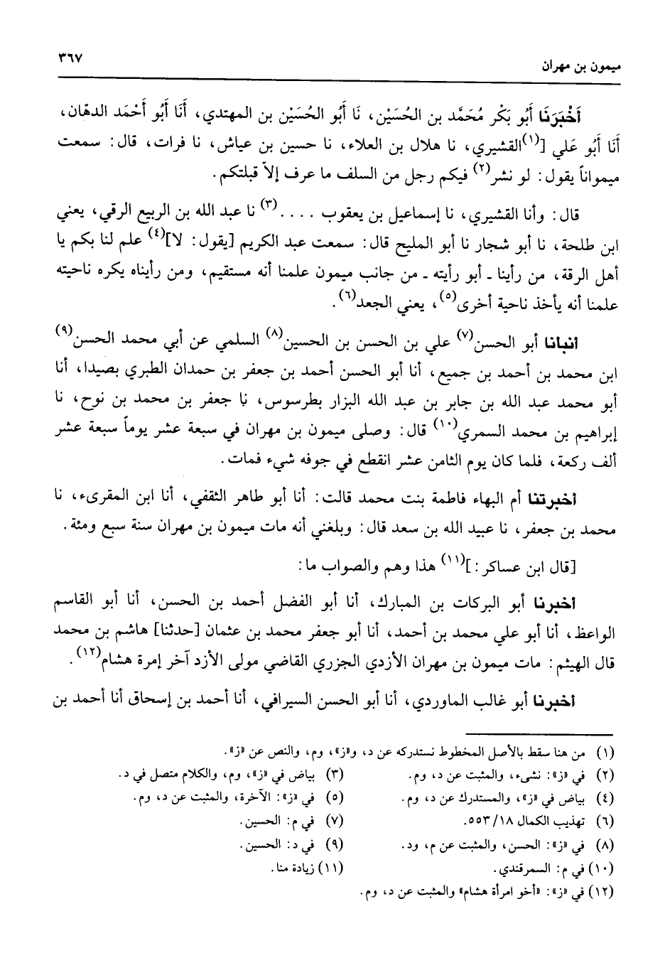 أخبرنا أبو بكر محمد بن الحسين نا أبو الحسين بن المهتدي أنا أبو أحمد الدهان أنا أبو علي (1) القشيري نا هلال بن العلاء نا حسين بن عياش نا فرات قال سمعت ميمونا يقول لو نشر (2) فيكم رجل من السلف ما عرف إلا قبلتكم قال وأنا القشيري نا إسماعيل بن يعقوب (3) نا عبد الله بن الربيع الرقي يعني ابن طلحة نا أبو شجار نا أبو المليح قال سمعت عبد الكريم يقول لا (4) علم لنا بكم يا أهل الرقة من رأينا أبو رأيته من جانب ميمون علمنا أنه مستقيم ومن رأيناه يكره ناحيته علمنا أنه يأخذ ناحية أخرى (5) يعني الجعد (6) أنبأنا أبو الحسن (7) علي بن الحسن بن الحسين (8) السلمي عن أبي محمد الحسن (9) ابن محمد بن أحمد بن جميع أنا أبو الحسن أحمد بن جعفر بن حمدان الطبري بصيدا أنا أبو محمد عبد الله بن جابر بن عبد الله البزار بطرسوس نا جعفر بن محمد بن نوح نا إبراهيم بن محمد السمري (10) قال وصلى ميمون بن مهران في سبعة عشر يوما سبعة عشر ألف ركعة فلما كان يوم الثامن عشر انقطع في جوفه شئ فمات أخبرتنا أم البهاء فاطمة بنت محمد قالت أنا أبو طاهر الثقفي أنا ابن المقرئ نا محمد بن جعفر نا عبيد الله بن سعد قال وبلغني أنه مات ميمون بن مهران سنة سبع ومائة قال ابن عساكر (11) هذا وهم والصواب ما أخبرنا أبو البركات بن المبارك أنا أبو الفضل أحمد بن الحسن أنا أبو القاسم الواعظ أنا أبو علي محمد بن أحمد أنا أبو جعفر محمد بن عثمان حدثنا هاشم بن محمد قال الهيثم مات ميمون بن مهران الأزدي الجزري القاضي مولى الأزد آخر إمرة هشام (12) أخبرنا أبو غالب الماوردي أنا أبو الحسن السيرافي أنا أحمد بن إسحاق أنا أحمد بن
