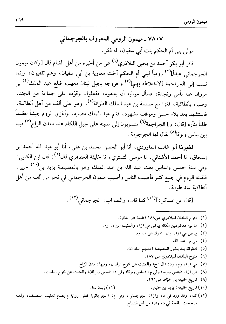 7807 - ميمون الرومي المعروف بالجرجماني مولى بني أم الحكم بنت أبي سفيان له ذكر ذكر أبو بكر أحمد بن يحيى البلاذري (1) عن من أخبره من أهل الشام قال وكان ميمون الجرجماني عبدا (2) روميا لبني أم الحكم أخت معاوية بن أبي سفيان وهم ثقفيون وإنما نسب إلى الجراجمة لاختلاطه بهم (3) وخروجه بجبل لبنان معهم فبلغ عبد الملك (4) بن مروان عنه بأس ونجدة فسأل مواليه أن يعتقوه ففعلوا وقوده على جماعة من الجند وصيره بأنطاكية فغزا مع مسلمة بن عبد الملك الطوانة (5) وهو على ألف من أهل أنطاكية فاستشهد بعد بلاء حسن وموقف مشهود فغم عبد الملك مصابه وأغزى الروم جيشا عظيما طلبا بثأره قال والجراجمة (6) منسوبون إلى مدينة على جبل اللكام عند معدن الزاج (7) فيما بين بياس وبوقا (8) يقال لها الجرجومة أخبرنا أبو غالب الماوردي أنا أبو الحسن محمد بن علي أنا أبو عبد الله أحمد بن إسحاق نا أحمد الأشناني نا موسى التستري نا خليفة العصفري قال (9) قال ابن الكلبي وفي سنة خمس وثمانين بعث عبد الله بن عبد الملك وهو بالمصيصة يزيد بن (10) جبير فلقيته الروم في جمع كثير فأصيب الناس وأصيب ميمون الجرجماني في نحو من ألف من أهل أنطاكية عند طوانة قال ابن عساكر (11) كذا قال والصواب الجرجماني (12)