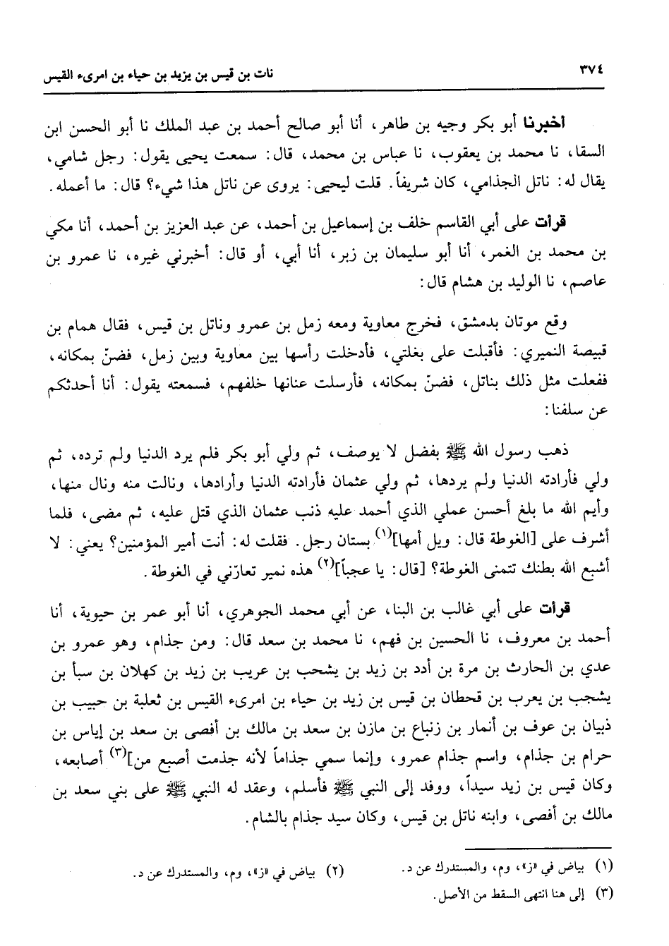أخبرنا أبو بكر وجيه بن طاهر أنا أبو صالح أحمد بن عبد الملك نا أبو الحسن ابن السقا نا محمد بن يعقوب نا عباس بن محمد قال سمعت يحيى يقول رجل شامي يقال له ناتل الجذامي كان شريفا قلت ليحيى يروى عن ناتل هذا شئ قال ما أعمله قرأت على أبي القاسم خلف بن إسماعيل بن أحمد عن عبد العزيز بن أحمد أنا مكي بن محمد بن الغمر أنا أبو سليمان بن زبر أنا أبي أو قال أخبرني غيره نا عمرو بن عاصم نا الوليد بن هشام قال وقع موتان بدمشق فخرج معاوية ومعه زمل بن عمرو وناتل بن قيس فقال همام بن قبيصة النميري فأقبلت على بغلتي فأدخلت رأسها بين معاوية وبين زمل فضن بمكانه ففعلت مثل ذلك بناتل فضن بمكانه فأرسلت عنانها خلفهم فسمعته يقول أنا أحدثكم عن سلفنا ذهب رسول الله (صلى الله عليه وسلم) بفضل لا يوصف ثم ولي أبو بكر فلم يرد الدنيا ولم ترده ثم ولي فأرادته الدنيا ولم يردها ثم ولي عثمان فأرادته الدنيا وأرادها ونالت منه ونال منها وأيم الله ما بلغ أحسن عملي الذي أحمد عليه ذنب عثمان الذي قتل عليه ثم مضى فلما أشرف على الغوطة قال ويل أمها (1) بستان رجل فقلت له أنت أمير المؤمنين يعني لا اشبع الله بطنك تتمنى الغوطة قال يا عجبا (2) هذه نمير تعارني في الغوطة قرأت على أبي غالب بن البنا عن أبي محمد الجوهري أنا أبو عمر بن حيوية أنا أحمد بن معروف نا الحسين بن فهم نا محمد بن سعد قال ومن جذام وهو عمرو بن عدي بن الحارث بن مرة بن أدد بن زيد بن يشحب بن عريب بن زيد بن كهلان بن سبأ بن يشجب بن يعرب بن قحطان بن قيس بن زيد بن حياء بن امرئ القيس بن ثعلبة بن حبيب بن ذبيان بن عوف بن أنمار بن زنباع بن مازن بن سعد بن مالك بن أفصى بن سعد بن إياس بن حرام بن جذام واسم جذام عمرو وإنما سمي جذاما لأنه جذمت أصبع من (3) أصابعه وكان قيس بن زيد سيدا ووفد إلى النبي (صلى الله عليه وسلم) فأسلم وعقد له النبي (صلى الله عليه وسلم) على بني سعد بن مالك بن أفصى وابنه ناتل بن قيس وكان سيد جذام بالشام