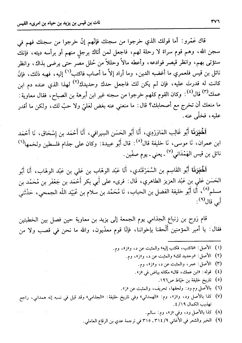 قال عمرو أما قولك الذي خرجوا من سجنك فإنهم إن خرجوا من سجنك فهم في سجن الله وهم قوم سراة لا رحلة لهم فاجعل لمن أتاك برجل منهم أو برأسه ديته فإنك ستؤتى بهم وانظر قيصر فوادعه وأعطه مالا وحللا من حلل مصر حتى يرضى بذاك وانظر ناتل بن قيس فلعمري ما أغضبه الدين وما أراد إلا ما أصاب فاكتب (1) إليه فهبه ذلك فإن كانت له قدرت عليه فإن لم يكن لك فاجعل حدك وحديدك (2) لهذا الذي عنده دم ابن عمك (3) قال (4) وكان القوم كلهم خرجوا من سجنه غير ابن أبرهة بن الصباح فقال معاوية ما منعك أن تخرج مع أصحابك قال ما منعني عنه بغض لعلي ولا حب لك ولكن ما أقدر عليه فخلى عنه أخبرنا أبو غالب الماوردي أنا أبو الحسن السيرافي أنا أحمد بن إسحاق نا أحمد ابن عمران نا موسى نا خليفة قال (5) قال أبو عبيدة وكان على جذام فلسطين ولخمها (6) ناتل بن قيس الهمداني (7) يعني يوم صفين أخبرنا أبو القاسم بن السمرقندي أنا عبد الوهاب بن علي بن عبد الوهاب أنا أبو الحسن علي بن عبد العزيز الطاهري قال قرئ على أبي بكر أحمد بن جعفر بن محمد بن مسلم (8) أنا أبو خليفة الفضل بن الحباب نا محمد بن سلام بن عبيد الله الجمحي حدثني أبي قال (9) قام روح بن زنباع الجذامي يوم الجمعة إلى يزيد بن معاوية حين فصل بين الخطبتين فقال يا أمير المؤمنين ألحقنا بإخواننا فإنا قوم معديون والله ما نحن في قصب ولا من