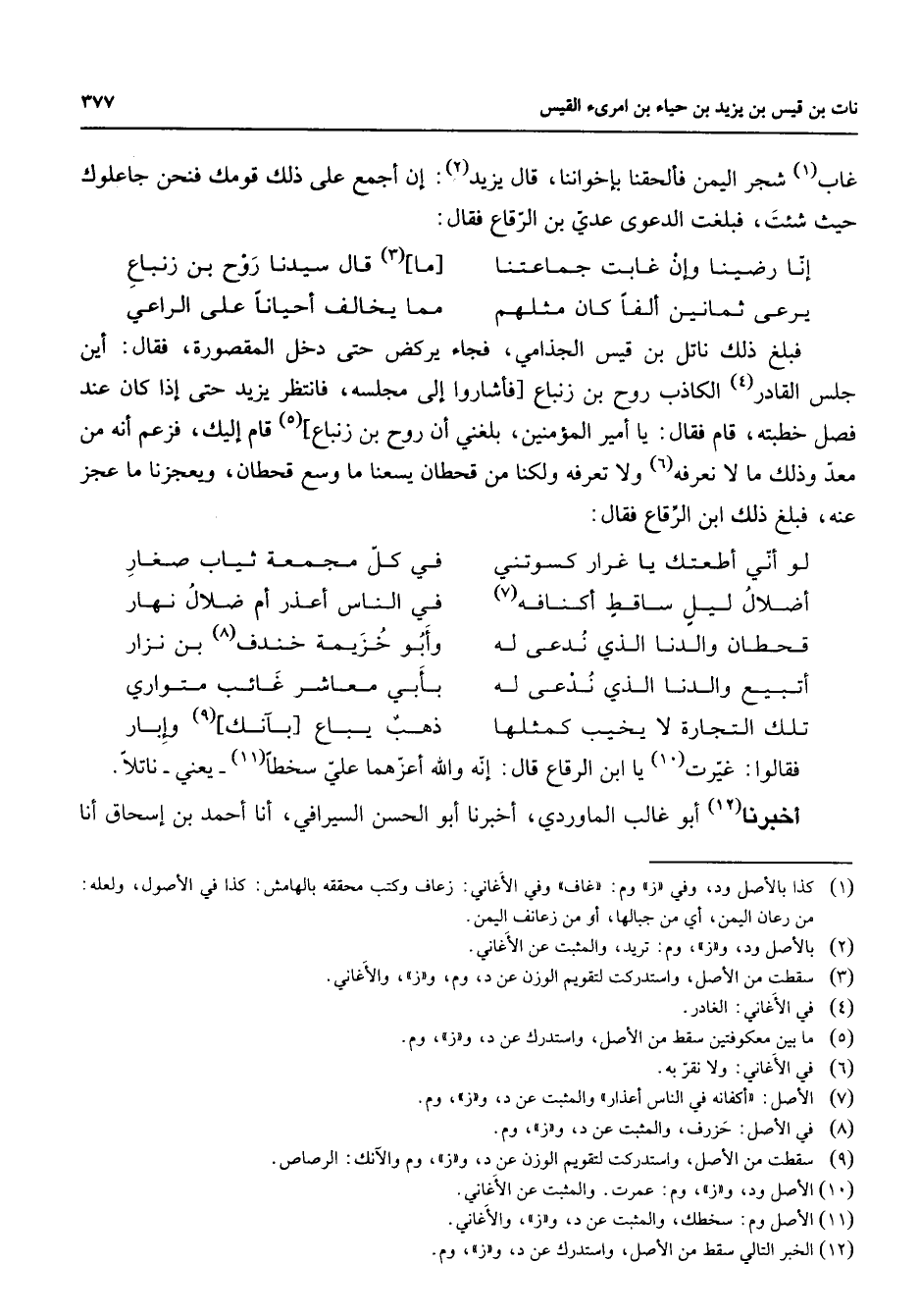 غاب (1) شجر اليمن فألحقنا بإخواننا قال يزيد (2) إن أجمع على ذلك قومك فنحن جاعلوك حيث شئت فبلغت الدعوى عدي بن الرقاع فقال * أنا رضينا وإن غابت جماعتنا * ما (3) قال سيدنا روح بن زنباع يرعى ثمانين ألفا كان مثلهم * مما يخالف أحيانا على الراعي * فبلغ ذلك ناتل بن قيس الجذامي فجاء يركض حتى دخل المقصورة فقال أين جلس القادر (4) الكاذب روح بن زنباع فأشاروا إلى مجلسه فانتظر يزيد حتى إذا كان عند فصل قام خطبته فقال يا أمير المؤمنين بلغني أن روح بن زنباع (5) قام إليك فزعم أنه من معد وذلك ما لا نعرفه (6) ولا تعرفه ولكنا من قحطان يسعنا ما وسع قحطان ويعجزنا ما عجز عنه فبلغ ذلك ابن الرقاع فقال * لو أني أطعتك يا غرار كسوتني * في كل مجمعة ثياب صغار أضلال ليل ساقط أكنافه (7) * في الناس أعذر أم ضلال نهار قحطان والدنا الذي ندعى له * وأبو خزيمة خندف (8) بن نزار أتبيع والدنا الذي ندعى له * بأبي معاشر غائب متواري تلك التجارة لا يخيب كمثلها * ذهب يباع بآنك (9) وإبار * فقالوا غيرت (10) يا ابن الرقاع قال إنه والله أعزهما علي سخطا (11) يعني ناتلا أخبرنا (12) أبو غالب الماوردي أخبرنا أبو الحسن السيرافي أنا أحمد بن إسحاق أنا
