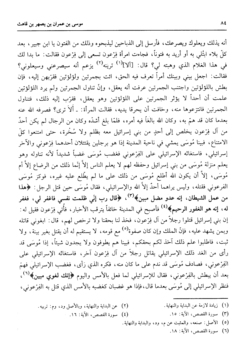 أنه يذلك ويعلوك ويصرعك فأرسل إلى الذباحين ليذبحوه وذلك من الفتون يا ابن جبير بعد كل بلاء ابتلي به أو أريد به فتونا فجاءت امرأة فرعون تسعى إلى فرعون فقالت ما بدا لك في هذا الغلام الذي وهبته لي قال ألا (1) ترينه (2) يزعم أنه سيصرعني وسيعلوني فقالت اجعل بيني وبينك أمرا تعرف فيه الحق ائت بجمرتين ولؤلؤتين فقربهن إليه فإن بطش باللؤلؤتين واجتنب الجمرتين عرفت أنه يعقل وإن تناول الجمرتين ولم يرد اللؤلؤتين علمت أن أحدا لا يؤثر الجمرتين على اللؤلؤتين وهو يعقل فقرب إليه ذلك فتناول الجمرتين فانتزعوها منه وخافت أن يحرقا يديه فقالت المرأة ألا ترى فصرفه الله عنه بعدما كان قد هم به وكان الله بالغا فيه أمره فلما بلغ أشده وكان من الرجال لم يكن أحد من آل فرعون يخلص إلى أحد من بني إسرائيل معه بظلم ولا سخرة حتى امتنعوا كل الامتناع فبينا موسى يمشي في ناحية المدينة إذا هو برجلين يقتتلان أحدهما فرعوني والآخر إسرائيلي فاستغاثه الاسرائيلي على الفرعوني فغضب موسى غضبا شديدا لأنه تناوله وهو يعلم منزلة موسى من بني إسرائيل وحفظه لهم لا يعلم الناس إلا إنما ذلك من الرضاع إلا أم موسى إلا أن يكون الله أطلع موسى من ذلك على ما لم يطلع عليه غيره فوكز موسى الفرعوني فقتله وليس يراهما أحد إلا الله والإسرائيلي فقال موسى حين قتل الرجل " هذا من عمل الشيطان إنه عدو مضل مبين " (3) " قال رب إني ظلمت نفسي فاغفر لي فغفر له إنه هو الغفور الرحيم " (4) فأصبح في المدينة خائفا يترقب الأخبار فأتي فرعون فقيل له إن بني إسرائيل قتلوا رجلا من آل فرعون فخذ لنا بحقنا ولا ترخص لهم قال ابغوني قاتله وبمن يشهد عليه فإن الملك وإن كان صفوة (5) مع قومه لا يستقيم له أن يقتل بغير بينة ولا ثبت فاطلبوا علم ذلك آخذ لكم بحقكم فبينا هم يطوفون ولا يجدون شيئا إذا موسى قد رأى من الغد ذلك الاسرائيلي يقاتل رجلا من آل فرعون آخر فاستغاثه الاسرائيلي على الفرعوني فصادف موسى قد ندم على ما كان منه فكره الذي رأى فغضب الاسرائيلي فهم بعد أن يبطش بالفرعوني فقال للاسرائيلي لما فعل بالأمس واليوم " إنك لغوي مبين " (6) فنظر الإسرائيلي إلى موسى بعدما قال فإذا هو غضبان كغضبه بالأمس الذي قتل به الفرعوني