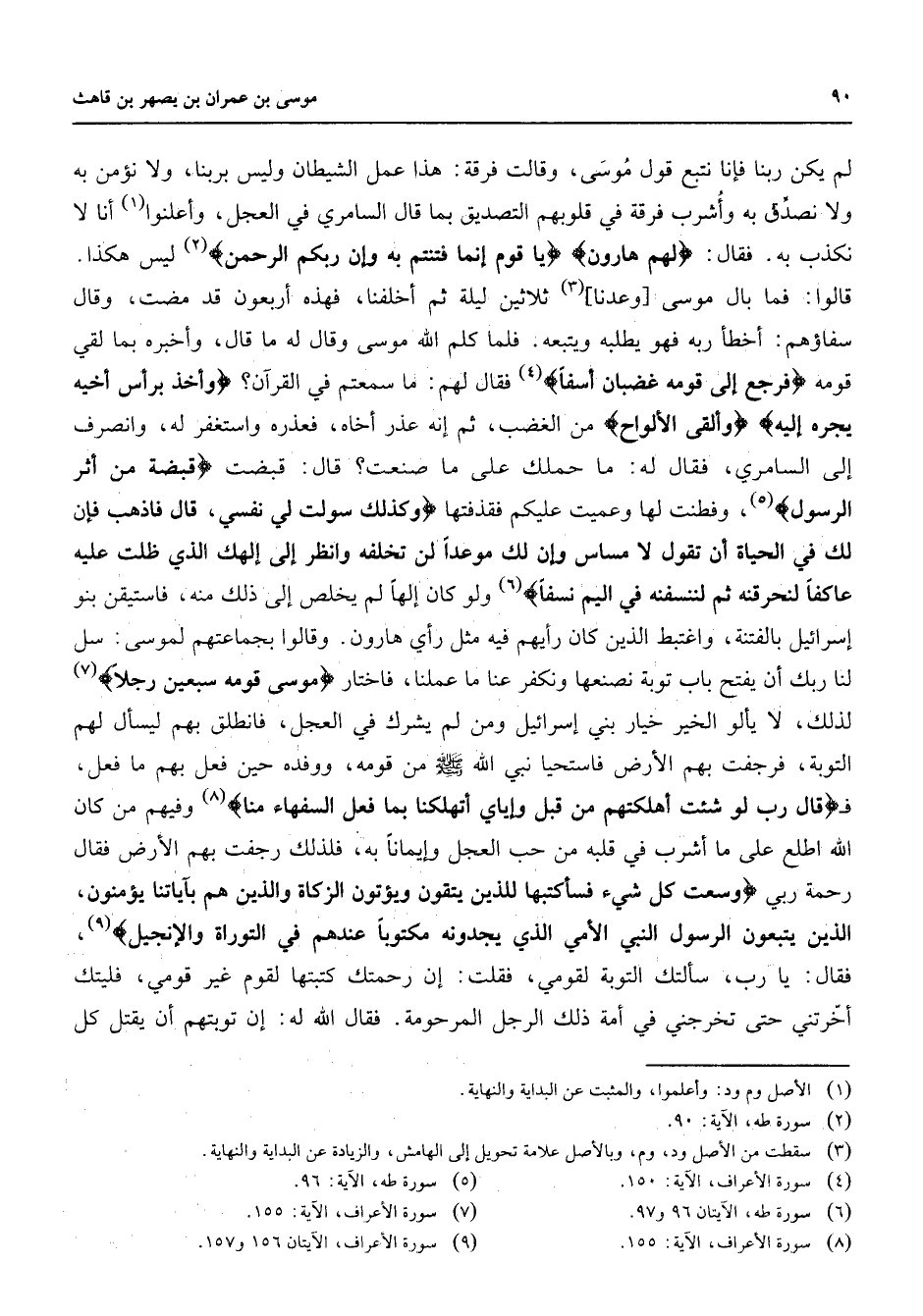لم يكن ربنا فإنا نتبع قول موسى وقالت فرقة هذا عمل الشيطان وليس بربنا ولا نؤمن به ولا نصدق به وأشرب فرقة في قلوبهم التصديق بما قال السامري في العجل وأعلنوا (1) أنا لا نكذب به فقال " لهم هارون " " يا قوم إنما فتنتم به وإن ربكم الرحمن " (2) ليس هكذا قالوا فما بال موسى وعدنا (3) ثلاثين ليلة ثم أخلفنا فهذه أربعون قد مضت وقال سفاؤهم أخطأ ربه فهو يطلبه ويتبعه فلما كلم الله موسى وقال له ما قال وأخبره بما لقي قومه " فرجع إلى قومه غضبان أسفا " (4) فقال لهم ما سمعتم في القرآن " وأخذ برأس أخيه يجره إليه " " وألقى الألواح " من الغضب ثم إنه عذر أخاه فعذره واستغفر له وانصرف إلى السامري فقال له ما حملك على ما صنعت قال قبضت " قبضة من أثر الرسول " (5) وفطنت لها وعميت عليكم فقذفتها " وكذلك سولت لي نفسي قال فاذهب فإن لك في الحياة أن تقول لا مساس وإن لك موعدا لن تخلفه وانظر إلى الهك الذي ظلت عليه عاكفا لنحرقنه ثم لننسفنه في اليم نسفا " (6) ولو كان إلها لم يخلص إلى ذلك منه فاستيقن بنو إسرائيل بالفتنة واغتبط الذين كان رأيهم فيه مثل رأي هارون وقالوا بجماعتهم لموسى سل لنا ربك أن يفتح باب توبة نصنعها ونكفر عنا ما عملنا فاختار " موسى قومه سبعين رجلا " (7) لذلك لا يألو الخير خيار بني إسرائيل ومن لم يشرك في العجل فانطلق بهم ليسأل لهم التوبة فرجفت بهم الأرض فاستحيا نبي الله (صلى الله عليه وسلم) من قومه ووفده حين فعل بهم ما فعل ف " قال رب لو شئت أهلكتهم من قبل وإياي أتهلكنا بما فعل السفهاء منا " (8) وفيهم من كان الله اطلع على ما أشرب في قلبه من حب العجل وإيمانا به فلذلك رجفت بهم الأرض فقال رحمة ربي " وسعت كل شئ فسأكتبها للذين يتقون ويؤتون الزكاة والذين هم بآياتنا يؤمنون الذين يتبعون الرسول النبي الأمي الذي يجدونه مكتوبا عندهم في التوراة والإنجيل " (9) فقال يا رب سألتك التوبة لقومي فقلت إن رحمتك كتبتها لقوم غير قومي فليتك أخرتني حتى تخرجني في أمة ذلك الرجل المرحومة فقال الله له إن توبتهم أن يقتل كل
