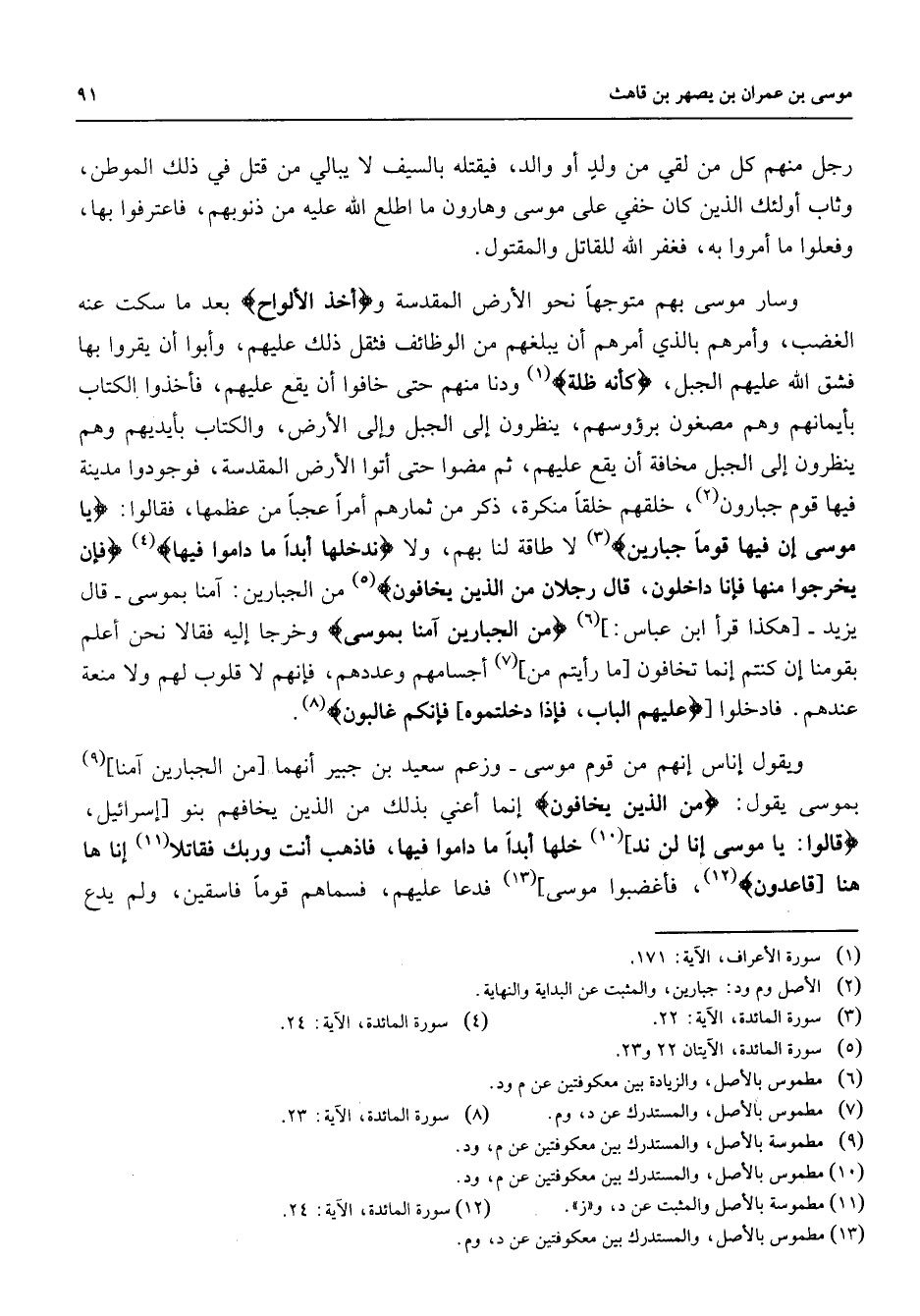 رجل منهم كل من لقي من ولد أو والد فيقتله بالسيف لا يبالي من قتل في ذلك الموطن وثاب أولئك الذين كان خفي على موسى وهارون ما اطلع الله عليه من ذنوبهم فاعترفوا بها وفعلوا ما أمروا به فغفر الله للقاتل والمقتول وسار موسى بهم متوجها نحو الأرض المقدسة و " أخذ الألواح " بعد ما سكت عنه الغضب وأمرهم بالذي أمرهم أن يبلغهم من الوظائف فثقل ذلك عليهم وأبوا أن يقروا بها فشق الله عليهم الجبل " كأنه ظلة " (1) ودنا منهم حتى خافوا أن يقع عليهم فأخذوا الكتاب بأيمانهم وهم مصغون برؤوسهم ينظرون إلى الجبل وإلى الأرض والكتاب بأيديهم وهم ينظرون إلى الجبل مخافة أن يقع عليهم ثم مضوا حتى أتوا الأرض المقدسة فوجدوا مدينة فيها قوم جبارون (2) خلقهم خلقا منكرة ذكر من ثمارهم أمرا عجبا من عظمها فقالوا " يا موسى إن فيها قوما جبارين " (3) لا طاقة لنا بهم ولا " ندخلها أبدا ما داموا فيها " (4) " فإن يخرجوا منها فإنا داخلون قال رجلان من الذين يخافون " (5) من الجبارين آمنا بموسى قال يزيد هكذا قرأ ابن عباس (6) " من الجبارين آمنا بموسى " وخرجا إليه فقالا نحن أعلم بقومنا إن كنتم إنما تخافون ما رأيتم من (7) أجسامهم وعددهم فإنهم لا قلوب لهم ولا منعة عندهم فادخلوا " عليهم الباب فإذا دخلتموه فإنكم غالبون " (8) ويقول إناس إنهم من قوم موسى وزعم سعيد بن جبير أنهما من الجبارين آمنا (9) ى يقول " من الذين يخافون " إنما أعني بذلك من الذين يخافهم بنو إسرائيل " قالوا يا موسى إنا لن (10) ندخلها أبدا ما داموا فيها فاذهب أنت وربك فقاتلا (11) إنا ها هنا قاعدون " (12) فأغضبوا موسى (13) فدعا عليهم فسماهم قوما فاسقين ولم يدع