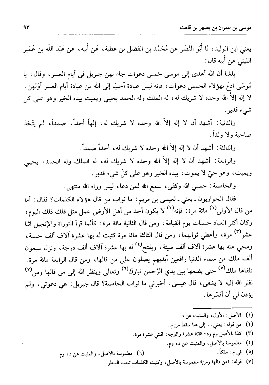 يعني ابن الوليد نا أبو النضر عن محمد بن الفضل بن عطية عن أبيه عن عبد الله بن عمير الليثي عن أبيه قال بلغنا أن الله أهدى إلى موسى خمس دعوات جاء بهن جبريل في أيام العسر وقال يا موسى ادع بهؤلاء الخمس دعوات فإنه ليس عبادة أحب إلى الله من عبادة أيام العسر أولهن لا إله إلا الله وحده لا شريك له له الملك وله الحمد يحيي ويميت بيده الخير وهو على كل شئ قدير والثانية أشهد أن لا إله إلا الله وحده لا شريك له إلها أحدا صمدا لم يتخذ صاحبة ولا ولدا والثالثة أشهد أن لا إله إلا الله وحده لا شريك له أحدا صمدا والرابعة أشهد أن لا إله إلا وحده لا شريك له له الملك وله الحمد يحيي ويميت وهو حي لا يموت بيده الخير وهو على كل شئ قدير والخامسة حسبي الله وكفى سمع الله لمن دعا ليس وراء الله منتهى فقال الحواريون يعني لعيسى بن مريم ما ثواب من قال هؤلاء الكلمات فقال أما من قال الأولى (1) مائة مرة فإنه (2) لا يكون أحد من أهل الأرض عمل مثل ذلك اليوم وكان أكثر العباد حسنات يوم القيامة ومن قال الثانية مائة مرة كأنما قرأ التوراة والإنجيل اثنا عشر (3) مرة وأعطي ثوابهما ومن قال الثالثة مائة مرة كتبت له بها عشرة آلاف ألف حسنة ومحي عنه بها عشرة آلاف ألف سيئة ويفتح (4) له بها عشرة آلاف ألف درجة ونزل سبعون ألف ملك من سماء الدنيا رافعين أيديهم يصلون على من قالها ومن قال الرابعة مائة مرة تلقاها ملك (5) حتى يضعها بين يدي الرحمن تبارك (6) وتعالى وينظر الله إلى من قالها ومن (7) نظر الله إليه لا يشقى قال عيسى أخبرني ما ثواب الخامسة قال جبريل هي دعوتي ولم يؤذن لي أن أفسرها