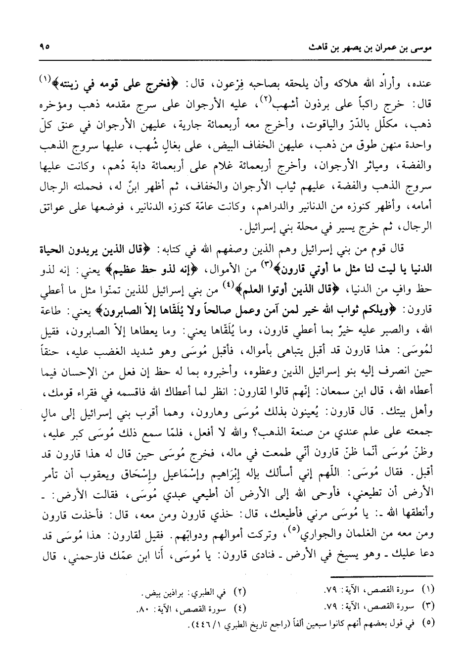 عنده وأراد الله هلاكه وأن يلحقه بصاحبه فرعون قال " فخرج على قومه في زينته " (1) قال خرج راكبا على برذون أشهب (2) عليه الأرجوان على سرج مقدمه ذهب ومؤخره ذهب مكلل بالدر والياقوت وأخرج معه أربعمائة جارية عليهن الأرجوان في عنق كل واحدة منهن طوق من ذهب عليهن الخفاف البيض على بغال شهب عليها سروج الذهب والفضة ومياثر الأرجوان وأخرج أربعمائة غلام على أربعمائة دابة دهم وكانت عليها سروج الذهب والفضة عليهم ثياب الأرجوان والخفاف ثم أظهر ابن له فحملته الرجال أمامه وأظهر كنوزه من الدنانير والدراهم وكانت عامة كنوزه الدنانير فوضعها على عواتق الرجال ثم خرج يسير في محلة بني إسرائيل قال قوم من بني إسرائيل وهم الذين وصفهم الله في كتابه " قال الذين يريدون الحياة الدنيا يا ليت لنا مثل ما أوتي قارون " (3) من الأموال " إنه لذو حظ عظيم " يعني إنه لذو حظ واف من الدنيا " قال الذين أوتوا العلم " (4) من بني إسرائيل للذين تمنوا مثل ما أعطي قارون " ويلكم ثواب الله خير لمن آمن وعمل صالحا ولا يلقاها إلا الصابرون " يعني طاعة الله والصبر عليه خير بماأعطي قارون وما يلقاها يعني وما يعطاها إلا الصابرون فقيل لموسى هذا قارون قد أقبل يتباهى بأمواله فأقبل موسى وهو شديد الغضب عليه حنقا حين انصرف إليه بنو إسرائيل الذين وعظوه وأخبروه بما له من حظ إن فعل من الإحسان فيما أعطاه الله قال ابن سمعان إنهم قالوا لقارون انظر لما أعطاك الله فاقسمه في فقراء قومك وأهل بيتك قال قارون يعينون بذلك موسى وهارون وهما أقرب بني إسرائيل إلى مال جمعته على علم عندي من صنعة الذهب والله لا أفعل فلما سمع ذلك موسى كبر عليه وظن موسى أنما ظن قارون أني طمعت في ماله فخرج موسى حين قال له هذا قارون قد أقبل فقال موسى اللهم إني أسألك بإله إبراهيم وإسماعيل وإسحاق ويعقوب أن تأمر الأرض أن تطيعني فأوحى الله إلى الأرض أن أطيعي عبدي موسى فقالت الأرض وأنطقها الله يا موسى مرني فأطيعك قال خذي قارون ومن معه قال فأخذت قارون ومن معه من الغلمان والجواري (5) وتركت أموالهم ودوابهم فقيل لقارون هذا موسى قد دعا عليك وهو يسيخ في الأرض فنادى قارون يا موسى أنا ابن عمك فارحمني قال