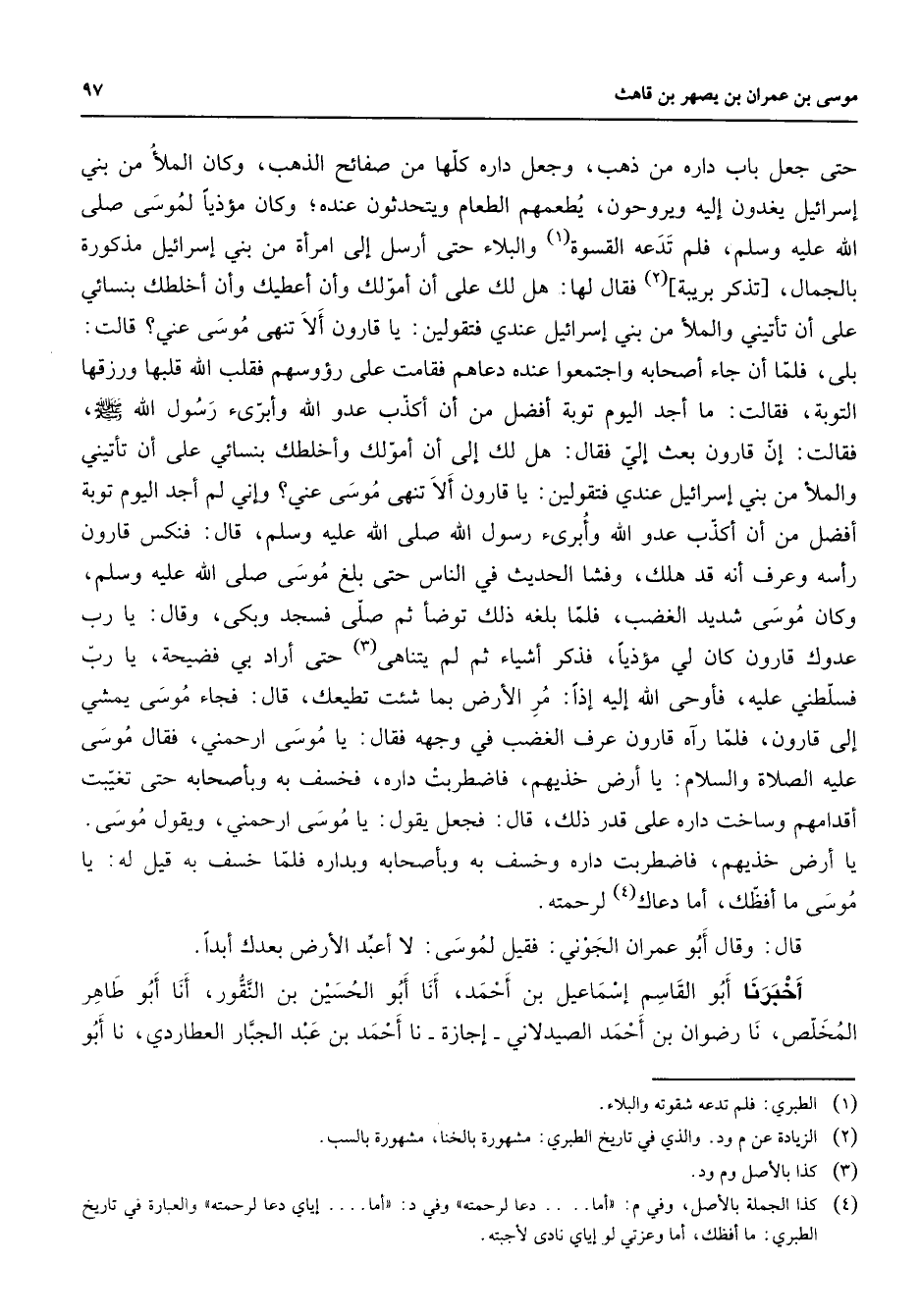 حتى جعل باب داره من ذهب وجعل داره كلها من صفائح الذهب وكان الملأ من بني إسرائيل يغدون إليه ويروحون يطعمهم الطعام ويتحدثون عنده وكان مؤذيا لموسى (صلى الله عليه وسلم) فلم تدعه القسوة (1) والبلاء حتى أرسل إلى امرأة من بني إسرائيل مذكورة بالجمال تذكر بريبة (2) فقال لها هل لك على أن أمولك وأن أعطيك وأن أخلطك بنسائي على أن تأتيني والملأ من بني إسرائيل عندي فتقولين يا قارون ألا تنهى موسى عني قالت بلى فلما أن جاء أصحابه واجتمعوا عنده دعاهم فقامت على رؤوسهم فقلب الله قلبها ورزقها التوبة فقالت ما أجد اليوم توبة أفضل من أن أكذب عدو الله وأبرئ رسول الله (صلى الله عليه وسلم) فقالت إن قارون بعث إلي فقال هل لك إلى أن أمولك وأخلطك بنسائي على أن تأتيني والملأ من بني إسرائيل عندي فتقولين يا قارون ألا تنهى موسى عني وإني لم أجد اليوم توبة أفضل من أن أكذب عدو الله وأبرئ رسول الله (صلى الله عليه وسلم) قال فنكس قارون رأسه وعرف أنه قد هلك وفشا الحديث في الناس حتى بلغ موسى (صلى الله عليه وسلم) وكان موسى شديد الغضب فلما بلغه ذلك توضأ ثم صلى فسجد وبكى وقال يا رب عدوك قارون كان لي مؤذيا فذكر أشياء ثم لم يتناهى (3) حتى أراد بي فضيحة يا رب فسلطني عليه فأوحى الله إليه إذا مر الأرض بما شئت تطيعك قال فجاء موسى يمشي إلى قارون فلما رآه قارون عرف الغضب في وجهه فقال يا موسى ارحمني فقال موسى عليه الصلاة والسلام يا أرض خذيهم فاضطربت داره فخسف به وبأصحابه حتى تغيبت أقدامهم وساخت داره على قدر ذلك قال فجعل يقول يا موسى ارحمني ويقول موسى يا أرض خذيهم فاضطربت داره وخسف به وبأصحابه وبداره فلما خسف به قيل له يا موسى ما أفظك أما دعاك (4) لرحمته " قال وقال أبو عمران الجوني فقيل لموسى لا أعبد الأرض بعدك أبدا أخبرنا أبو القاسم إسماعيل بن أحمد أنا أبو الحسين بن النقور أنا أبو طاهر المخلص نا رضوان بن أحمد الصيدلاني إجازة نا أحمد بن عبد الجبار العطاردي نا أبو