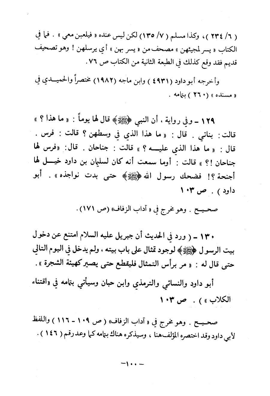 عن أم المؤمنين عائشة في رواية أن النبي (ص) قال لها يوما ما هذا قالت بناتي قال ماهذا الذي في وسطهن قالت فرس قال ما هذا الذي عليه قالت جناحان قال فرس لها جناحان قالت أوما سمعت أنه كان لسليمان بن داود خيل لها أجنحة فضحك رسول الله (ص) حتى بدت نواجذه أخرجه أبو داود وهو في آداب الزفاف للألباني