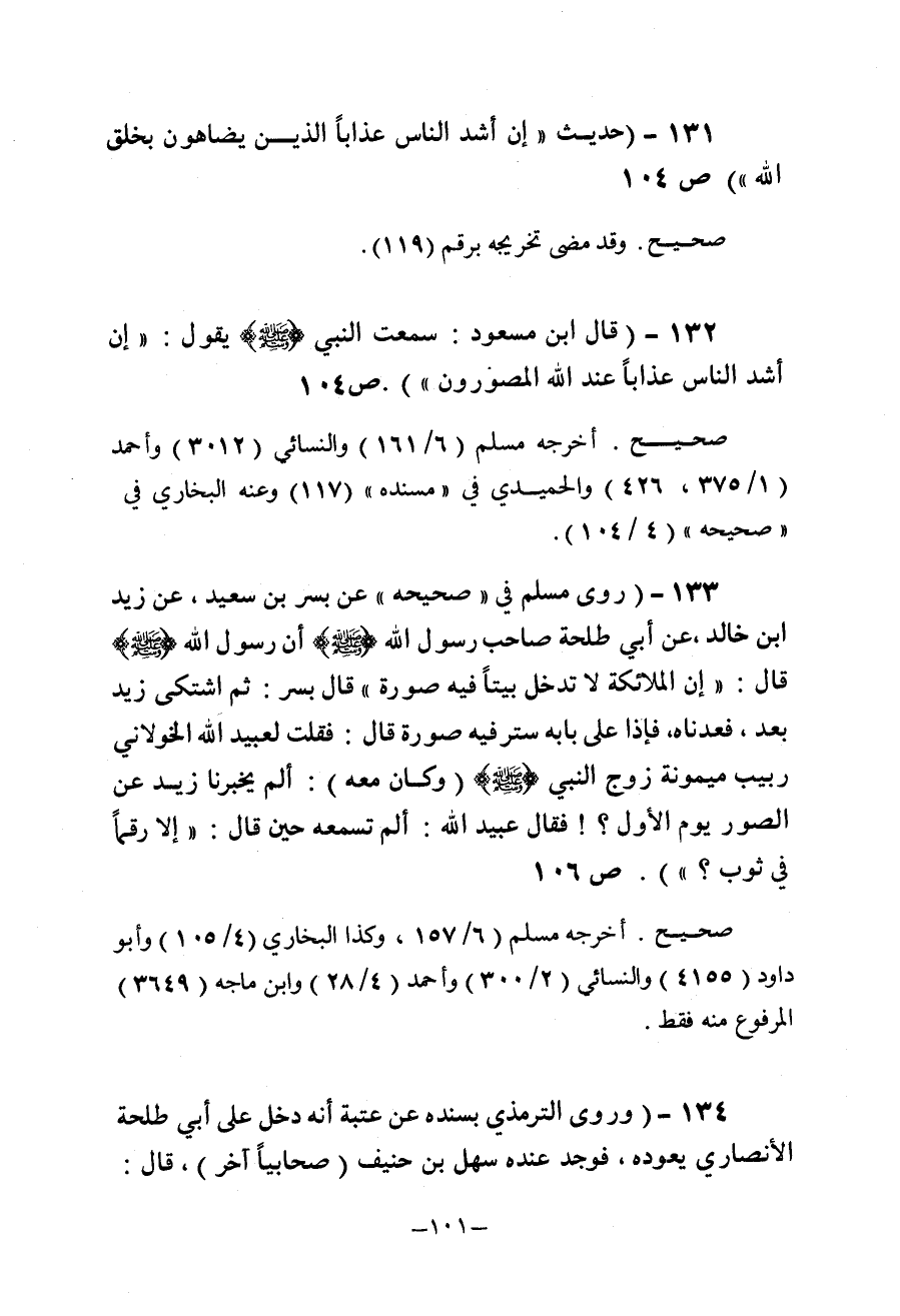 قال ابن مسعود: سمعت النبي (ص) يقول: إن أشد الناس عذابا عند الله المصورون أخرجه مسلم والنسائي وأحمد والحميدي وعنه البخاري في صحيحه