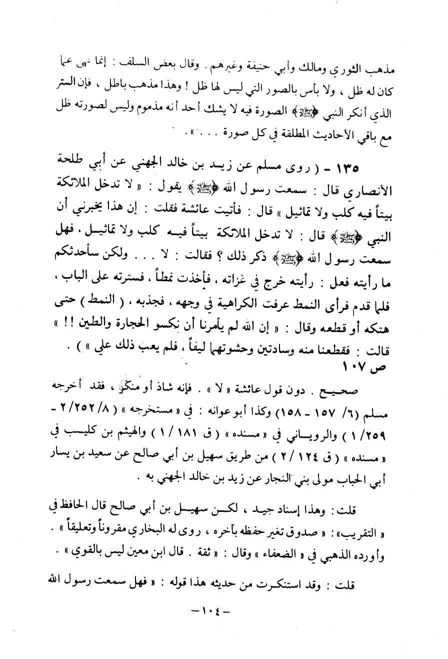 روى مسلم عن زيد بن خالد الجهني عن أبي طلحة الأنصاري قال: سمعت رسول الله (ص) يقول: لاتدخل الملائكة بيتا فيه كلب ولا تماثيل قال فأتيت عائشة فقلت إن هذا يخبرني أن النبي (ص) قال لاتدخل الملائكة بيتا فيه كلب ولا تماثيل فهل سمعت رسول الله (ص) ذكر ذلك فقالت لا ... ولكن سأحدثكم ما رأيته فعل رأيته خرج في غزاته فأخذت نمطا فسترته على الباب فلما قدم فرأى النمط عرفت الكراهية في وجهه فجذبه (النمط) حتى هتكه أو قطعه وقال إن الله لم يأمرنا أن نكسو الحجارة والطين قالت فقطعنا منه وسادتين وحشوتهما ليفا فلم يعب ذلك علي صحيح دون قول عائشة (لا) فإنه شاذ أومنكر تابع الشرح في الكتاب فهو مهم