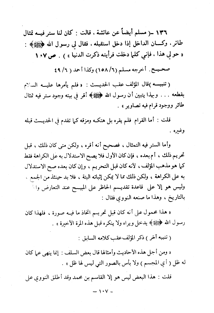عن عائشةقالت: كان لنا ستر فيه تمثال طائر وكان الداخل إذا دخل استقبله فقال لي رسول الله (ص) حولي هذا فإني كلما دخلت فرأيته ذكرت الدنيا أخرجه مسلم وأحمد قال النووي هذا محمول على أنه كان قبل تحريم اتخاذ ما فيه صورة انظر تعليق الألباني في الكتاب