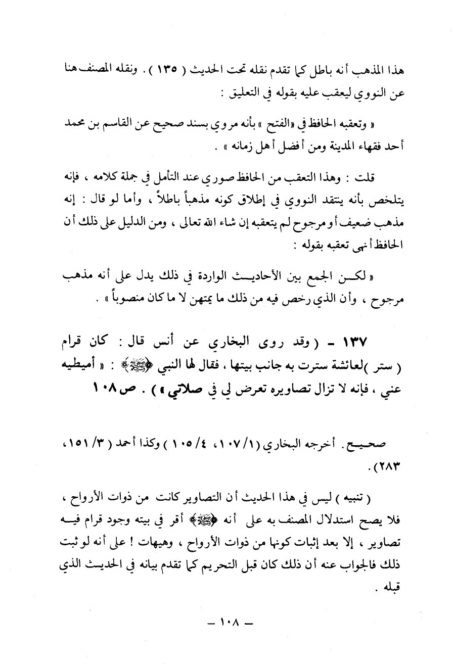 عن أنس قال كان قرام (ستر) لعائشة سترت به جانب بيتها فقال لها النبي (ص) أميطيه عني فإنه لا تزال تصاويره تعرض لي في صلاتي أخرجه البخاري وأحمد ليس في هذا الحديث أن التصاوير كانت ذوات أرواح ولا ندري إن كان هذا قبل التحريم أو بعده