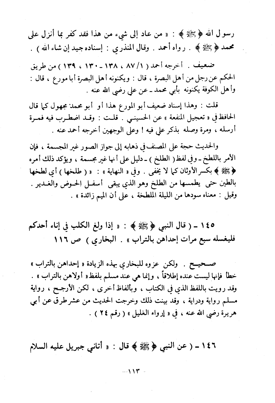 قال النبي (ص) إذا ولغ الكلب في إناء أحدكم فليغسله سبع مرات إحداهن بالتراب أخرجه البخاري ولكن عزوه للبخاري بهذه الزيادة إحداهن بالتراب خطأ فإنها ليست عنده إطلاقا وإنما هي عند مسلم بلفظ أولاهن بالتراب