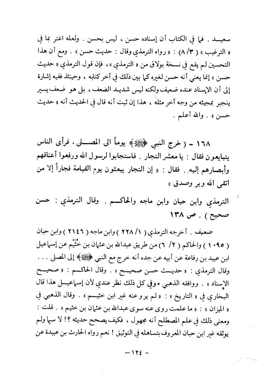 خرج النبي (ص) يوما الى المصلى فرأى الناس يتبايعون فقال: يا معشر التجار فاستجابوا لرسول الله ورفعوا أعناقهم وأبصارهم إليه فقال: إن التجار يبعثون يوم القيامة فجارا إلا من اتقى الله وبر وصدق ضعيف أخرجه الترمذي وابن ماجه وابن حبان والحاكم ويشهد للطرف الأول منه حديث عبد الرحمن بن شبل الأنصاري أن رسول الله (ص) قال: إن التجار هم الفجار قال رجل يا نبي الله ألم يحل البيع قال: إنهم يقولون فيكذبون ويحلفون ويأثمون أخرجه أحمد واسناده صحيح وأما باقيه فيختلف عنه