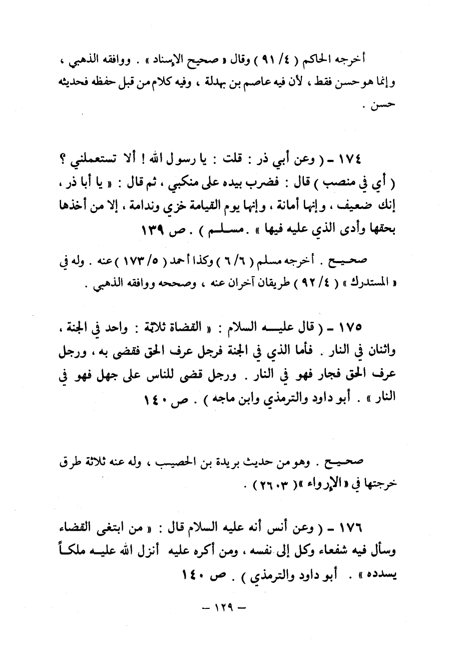 القضاة ثلاثة واحد في الجنة واثنان في النار فأما الذي في الجنة فرجل عرف الحق فقضى به ورجل عرف الحق فجار فهو في النار ورجل قضى للناس على جهل فهو في النار أخرجه أبو داود والترمذي وابن ماجه